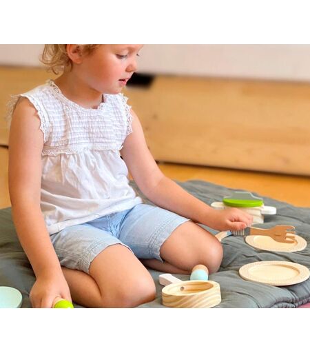 small foot Geschirr- und Topf-Set Farbe: Grün, blau, grau und Holz naturfarben Material: Holz Maße: Topf Höhe ca. 8 cm, Ø ca. 9,5 cm Länge Besteck ca. 13 cm Inhalt: Inkl. 2 Töpfen mit Deckel (1x groß, 1x klein), Messlöffel, 2 Pfannenwendern, 2 Tellern, 2 Gabeln, 2 Messern und 2 Gewürzbehältern Gewicht: Ca. 570 g Sonstige Hinweise: Artikel wird montiert geliefert Lieferung in 1 Packstück per Postversand bis zur Haustür Inselbelieferung möglich Lieferzeit 5-7 Werktage Hersteller: small foot GmbH & Co. KG Achimer Straße 5, 27755 Delmenhorst info@small-foot.de Hersteller-Artikel-Nummer: 11098 Umfangreiches Set aus robustem HolzModerne Farbgebung mit viel naturbelassenem HolzAbnehmbare Topfdeckel für realitätsnahes SpielenHandschmeichlerisches Holz, das sich von Kinderhänden gut greifen lässtInkl. Besteck und TellernInkl. 3 praktischer Küchenhelfer und Salz-/PfefferstreuernIdeale Ergänzung zu jeder KinderkücheKann zu fantasievollen Rollenspielen anregen ...
