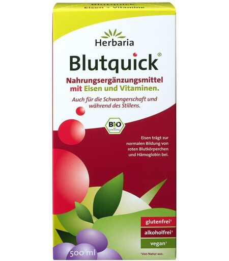 Anwendungsgebiet von Blutquick SaftBlutquick Saft bei erhöhtem Bedarf an Eisen und VitaminenWirkungsweise von Blutquick SaftEisen trägt zur normalen Bildung der roten Blutkörperchen und zur normalen Funktion des Immunsystems bei. Da Eisen vom Körper nicht selbst gebildet wird, muss es daher in ausreichender Menge mit der Nahrung aufgenommen werden.Wirkstoffe / Inhaltsstoffe / ZutatenZutaten von Blutquick Saft: