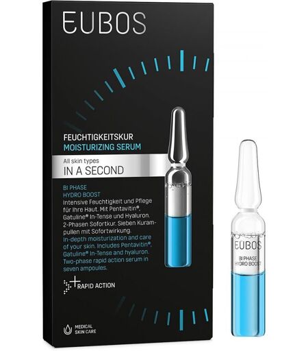 Eubos In A Second Feuchtigkeitskur Bi-Phase Hydro Booster - Intensive Feuchtigkeit und Pflege. Mit Sofortwirkung.Wirkungsweise von Eubos In A Second Feuchtigkeitskur Bi-Phase Hydro BoostDas Besondere von Eubos In A Second Feuchtigkeitskur Bi-Phase Hydro Boost: Die High-Tech-Wirkstoffe Pentavitin®, Gatuline® In-Tense und Hyaluronsäure sorgen für eine intensive Durchfeuchtung, speichern Feuchtigkeit und stärken das Kollagennetzwerk. Süßmandelöl und Brokkolisamenöl harmonisieren zusätzlich und versorgen die Haut mit wertvollen Pflegestoffen. Für intensive Feuchtigkeit & Pflege.Wirkstoffe / Inhaltsstoffe / ZutatenInhaltsstoffe von Eubos In A Second Feuchtigkeitskur Bi-Phase Hydro Boost: