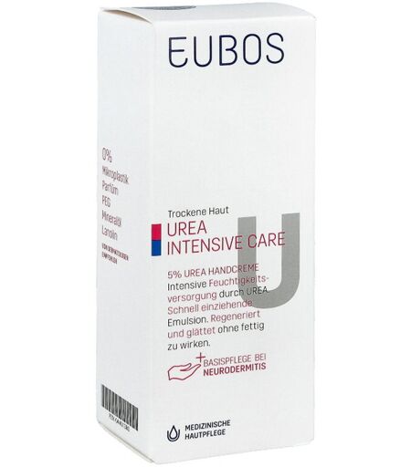 Anwendungsgebiet von Eubos Handcreme Urea Intensive Care 5 % Eubos Handcreme Urea Intensive Care 5 % ist eine medizinische, intensive Pflege für sehr trockene, rissige und stark beanspruchte Hände. Eubos Handcreme Urea Intensive Care 5 % eignet sich außerdem zur therapiebegleitenden Pflege, z. B. bei Psoriasis, Neurodermitis, Altershaut oder bei trockener Haut bei Diabetes. Eubos Handcreme Urea Intensive Care 5 % besteht aus einer Wasser-in-Öl-Emulsion, zieht schnell ein und hinterlässt keinen Fettfilm auf der Haut. Wirkungsweise von Eubos Handcreme Urea Intensive Care 5 % Eubos Handcreme Urea Intensive Care 5 % versorgt Ihre Haut mit feuchtigkeitsbindendem Urea, wodurch die Hydratationsfähigkeit der Haut deutlich erhöht wird. Der in Eubos Handcreme Urea Intensive Care 5 % enthaltene Vitaminkomplex mit Vitamin E, Pro-Vitamin B5 (D-Panthenol), Allantoin und dem Hautvitamin Niacinamid (Vitamin PP) hilft, die hauteigene Regeneration zu fördern und die Hautstruktur zu verbessern. Zusätzlich wirken wertvolle Pflegekomponenten mit Shéa-Butter lipidspendend und beruhigen gereizte und strapazierte Haut. Wirkstoffe / Inhaltsstoffe / ZutatenInhaltsstoffe (nach INCI) von Eubos Handcreme Urea Intensive Care 5 % :