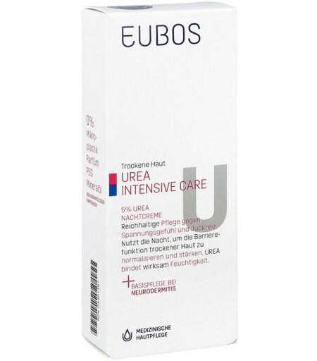 Anwendungsgebiet von Eubos Trockene Haut Urea 5% NachtcremeEubos Trockene Haut Urea 5% Nachtcreme pflegt intensiv trockene Gesichtshaut.Wirkungsweise von Eubos Trockene Haut Urea 5% NachtcremeMit Eubos Trockene Haut Urea 5% Nachtcreme können Sie Ihre trockene und spannende Gesichtshaut pflegen. Dazu enthält Eubos Trockene Haut Urea 5% Nachtcreme Urea und Nachtkerzenöl. Eubos Trockene Haut Urea 5% Nachtcreme ist auch zur Pflege einer Psoriasis oder Neurodermitis geeignet und kann täglich angewendet werden. Ihre Haut ist sichtbar hydratisierter und weniger gereizt. Eubos Trockene Haut Urea 5% Nachtcreme ist frei von Parfüm, PEG, Farbstoffen und Lanolin. Wirkstoffe / Inhaltsstoffe / ZutatenEubos Trockene Haut Urea 5% Nachtcreme enthält: