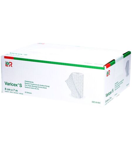 Varicex® S Zinkleimbinde 8 cm x 7 m Die Varicex® S Zinkleimbinde von Lohmann & Rauscher bietet eine schnelle und effektive Möglichkeit, halbstarre Dauerverbände zu applizieren. Sie ist besonders geeignet für die Behandlung von Thrombophlebitis, Ödembehandlung, chronischer venöser Insuffizienz und Ulcus cruris in der Heilungsphase sowie zur Nachsorge bei Frakturen. Dank der elastischen Eigenschaften passt sich die Binde auch an konische Körperstellen an und ermöglicht eine einfache Anwendung. Die Binden sind einzeln verpackt, was eine hygienische und unkomplizierte Anwendung unterstützt. Indikation Phlebologische und lymphologische Indikationen: Varikosis, Leitveneninsuffizienz, Thrombophlebitis, Phlebothrombose, postthrombotisches Syndrom, chronische Veneninsuffizienz der Stadien I bis III b (nach Widmer), Ulcus cruris venosum und mixtum, Ödeme (Phleb-, Lymph- und Lipödeme posttraumatisch, postoperativ, in der Schwangerschaft), nach Sklerosierung und venenchirurgischen Eingriffen. Kontusionen, Distorsionen, Sehnenverletzungen und Luxationen. Anwendung Vorbereitung: Vor dem Anlegen des Verbandes ist eine vorhandene Wunde zu reinigen / debridieren und entsprechend dem Wundstatus mit einem Wundverband abzudecken. Gegebenenfalls druckgefährdete Bereiche polstern. Es wird empfohlen, den Verband morgens vor dem Aufstehen oder nach längerer Hochlagerung des Beines anzulegen und den Patienten anschließend zu Gehübungen aufzufordern. Die Bindenbreite sollte dem Durchmesser des zu verbindenden Körperteils entsprechen. Anwendung: Varicex® kann mit Hilfe unterschiedlicher Techniken angelegt werden. Die Wickeltechnik erfolgt in Abstimmung mit dem behandelnden Arzt. Um eine maximale Gelenkbewegung zu erlangen wird empfohlen, den Verband am rechtwinkelig (90°) angewinkelten Fuß anzulegen. Verband so anlegen, dass keine Lücken entstehen. Der aufgerollte Teil der Binde (Bindenkopf) zeigt nach außen. Der Bindenkopf ist eng am Bein/Arm zu führen. Bei Lockerung des Verbandes ist der Verband zu erneuern. Zusammensetzung Trägermaterial: 80 % Viskose, 20 % Polyamid - mit Zinkleim beschichtet Zinkleim: Zinkoxid, Gelatine, Calciumchlorid, Glycerol, Wasser, Konservierungsmittel (Propyl-4-hydroxybenzoat, Methyl-4- hydroxybenzoat) und Geruchstoffe. Nebenwirkungen In sehr seltenen Fällen können Hautirritationen und / oder Allergien auftreten. ...
