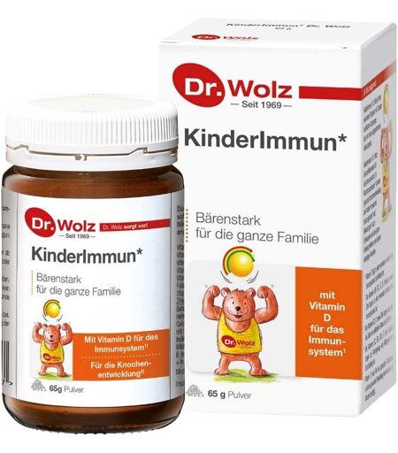 Nahrungsergänzungsmittel sind kein Ersatz für eine ausgewogene und abwechslungsreiche Ernährung und eine gesunde Lebensweise.KinderImmun Für das Immunsystem1,3 – KinderImmun* mit Vitaminen, Zink, Colostrum, (1,3)-(1,6)-Beta-D-Glucanen, Milchsäurebakterien (Bifidobacterium longum) und Inulin In der Wachstumsphase von Kindern2KinderImmun* wurde speziell für die Bedürfnisse des kindlichen Immunsystems1 entwickelt. Es enthält Vitamine, die das Immunsystem1, 3 stärken und das Wachstum2 von Kindern unterstützen. Auch Erwachsene können davon profitieren, da die Inhaltsstoffe auch zur Verringerung von Müdigkeit und Erschöpfung5 beitragen. Vitamin B2, C und Zink helfen zudem bei der Reduktion von oxidativem Stress4. Das Präparat ist geschmacksneutral und lässt sich ideal in kalte Speisen und Getränke für Kinder integrieren.* Speziell für Kinder: 1 Vitamin D trägt zu einer normalen Funktion des Immunsystems bei Kindern bei. 2 Vitamin D wird für ein gesundes Wachstum und eine gesunde Entwicklung der Knochen bei Kindern benötigt. Für die ganze Familie: 3 Die Vitamine B6, B12, C, D, Folsäure und Zink unterstützen die normale Funktion des Immunsystems. 4 Die Vitamine B2, C und Zink tragen dazu bei, die Zellen vor oxidativem Stress zu schützen.5 Die Vitamine B2, B6, B12, C und Folsäure helfen bei der Verringerung von Müdigkeit und Erschöpfung.Zutaten:Inulin, Beta-Glucane aus Hefe (Saccharomyces cerevisiae) 10%, Acerolasaftpulver 6%, Colostrum-Konzentrat (Milch) 6%, Milchsäurebakterien Bifidobacterium longum 1%, Zinkhefe (Hefe,Zinkcitrat) 1%, Vitamine: D3, B12, B6, B1, B2, FolsäureNährstoffdeklaration:Nährstoffebei 2 gbei 4 gVitamin D3 6,7 μg = 266 IU 133 %*13,3 μg = 532 IU266 %* Vitamin B1 0,44 mg / 40 %* 0,88 mg / 80 %*Vitamin B2 0,56 mg / 40 %* 1,1 mg / 80 %* Vitamin B6 0,56 m / 40 %* 1,1 mg / 80 %* Vitamin B12 1,0 μg /40 %* 2,0 μg / 80 %*Folsäure 80 μg / 40 %* 160 μg / 80 %*Vitamin C 32 mg / 40 %* 64 mg / 80 %* Zink 2,0 mg / 20 %* 4,0 mg / 40 %* Beta-Glucane aus Hefe(S. cerevisiae) 67 mg 133 mg Colostrum-Konzentrat 124 mg248 mg mit Immunglobulin G 25 mg 50 mg Inulin 1,5 g 3,0 g Milchsäurebakterien 18 mg36 mgVerzehrempfehlung: Kinder bis 6 Jahre nehmen 2 Messlöffel pro Tag. Kinder ab 7 Jahre und Erwachsene nehmen 3 Messlöffel pro Tag. Das Pulver kann in kalte Speisen und Getränke, z. B. Joghurt oder Müsli verrührt werden. Das Präparat sollte nicht an Säuglinge und Kleinkinder verabreicht werden. Hinweis: Die angegebene empfohlene tägliche Verzehrmenge nicht überschreiten. Aufbewahrungshinweis: Außerhalb der Reichweite von kleinen Kindern aufbewahren. Nettofüllmenge:65 gHerstellerdaten:Dr. Wolz Zell GmbHMarienthaler Str. 365366 Geisenheim ...