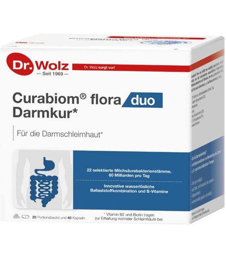 Wirkstoffe / Inhaltsstoffe / ZutatenZutaten von Curabiom Flora Duo Kombipackung: Portionsbeutel: Galacto-Oligosaccharide (aus Milch), Akazienfaser (Gummi arabicum), Inulin, Xylo-Oligosaccharide, 2’-O-Fucosyllactose (2’FL) (enthält Milchbestandteile), hydrolisiertes Shiitakeextraktpulver (Lentinula edodes) 0,01 %, Extraktmischung aus Königsbasilikum und Sonnenblumenkernen 0,01 %. Zutaten Kapsel: Kapselinhalt: lebende Milchsäurebakterien 69,3% (Lactobacillus acidophilus, Lactococcus lactis, Bifidobacterium lactis, Lactobacillus salivarius, Lactobacillus reuteri, Lactobacillus delbrueckii subsp. bulgaricus, Bifidobacterium breve, Lactobacillus gasseri, Lactobacillus fermentum, Lactobacillus rhamnosus, Bifidobacterium longum, Bifidobacterium infantis, Lactobacillus brevis, Streptococcus thermophilus, Lactobacillus paracasei, Lactobacillus casei, Lactobacillus plantarum, Bifidobacterium bifidum) Trennmittel: Cellulose Vitamine: B6, B2, B1, B12, Folsäure, Biotin. Kapselhülle: Hydroxypropylmethylcellulose. Zusammensetzung je Tagesportion (1 Portionsbeutel): Vitamin B1: 0,55 mg (50%*) Vitamin B2: 0,70 mg (50%*) Vitamin B6: 0,70 mg (50%*) Vitamin B12: 2,5 µg (100%*) Biotin: 50 µg (100%*) Folsäure: 100 µg (50%*) *Nährstoffnezugswerte gem. EU-Verordnung 1169/2011GegenanzeigenBei bekannter Überempfindlichkeit gegenüber einen der oben genannten Inhaltsstoffe sollte das Produkt nicht angewendet werden.DosierungVerzehrempfehlung von Curabiom Flora Duo Kombipackung: Erwachsene nehmen einmal täglich 1 Portionsbeutel und 2 Kapseln vor einer Mahlzeit ein. Geben Sie den Beutelinhalt in ein leeres Glas, füllen Sie es mit Wasser (ca. 200 ml) auf und rühren Sie den Inhalt gut um.HinweiseNahrungsergänzungsmittel sind kein Ersatz für eine ausgewogene, abwechslungsreiche Ernährung und eine gesunde Lebensweise. Die angegebene empfohlene tägliche Verzehrmenge darf nicht überschritten wer ...