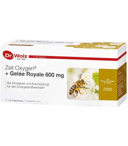 Nahrungsergänzungsmittel sind kein Ersatz für eine ausgewogene und abwechslungsreiche Ernährung und eine gesunde Lebensweise. Zell Oxygen® + Gelee Royale 600 mg Zell Oxygen® + Gelée Royale 600 mg ist die einzigartige Kombination der Enzym-Hefezellen Dr. Wolz® mit der Kraft aus dem Bienenstock. Die Kombination der Enzym-Hefezellen Dr. Wolz® mit Gelée Royale und ausgewählten B-Vitaminen wird gerne von Menschen zur Wiederherstellung ihrer körperlichen Kräfte nach Krankheit, bei Erschöpfung und Müdigkeit kurmäßig oder sogar im Dauergebrauch angewendet. Die Kombination der bewährten Enzym-Hefezellen Dr. Wolz® mit Gelée Royale und ausgewählten B-Vitaminen ergibt ein kraftvolles Energiepaket, das sich auch positiv auf das Hautbild auswirkt (3). Gelée Royale ist das einzigartige Nährkonzentrat, von dem die Bienenköniginnen leben. Die Wirkung von Gelée Royale auf die Königinnenlarve grenzt beinahe an ein Wunder. Binnen fünf Tagen erlangt sie das 1800-fache ihres Anfangsgewichtes und in weiteren elf Tagen die Fähigkeit, täglich 2000 Eier zu legen. Die Königin wird ihr ganzes Leben lang mit Gelée Royale gefüttert und wird so 4-5 Jahre alt. Eine Arbeitsbiene hingegen lebt nur 45 Tage. Deshalb ist die Bienenkönigin zum Symbol von Lebenskraft und Vitalität geworden.Lebenskraft und Vitalität Zur Reduzierung von Müdigkeit und Erschöpfung(1) Zur Unterstützung des Energiestoffwechsels(2)(1) Die in Zell Oxygen® + Gelée Royale 600 mg enthaltenen Vitamine B2, B6, B12, Niacin und Pantothensäure tragen zur Verringerung von Müdigkeit und Erschöpfung bei.(2) Alle enthaltenen B-Vitamine tragen zu einem normalen Energiestoffwechsel bei. (3) Die enthaltenen Vitamine B2, Biotin und Niacin tragen zur Erhaltung normaler Haut bei.Zutaten:Hefezellen* 59 %, Honig 26 %, Apfelsaft aus Apfelsaftkonzentrat, Fruchtsaftkonzentrat (Orange, Grapefruit, Zitrone, Sanddorn), inaktivierte getrocknete Hefezellen, Gelée Royale 3 %, Weizenkeimöl, Acerolasaftpulver, natürliches Aroma,´Nicotinamid, Pantothenat, Vitamin B12, Vitamin B6, Vitamin B1, Vitamin B2, Biotin*Enzym-Hefezellen Dr. Wolz®Nährstoffdeklaration: Nährstoffe Vitamin B1 1,1 mg100 %*Vitamin B2 1,4 mg 100 %*Vitamin B6 1,4 mg 100 %*Vitamin B12 2,5 μg 100 %*Niacin (NE) 16 mg 100 %*Pantothensäure 6 mg100 %*Biotin 50 μg 100 %*Enzym-Hefezellen Dr. Wolz® 12 g 120 Mrd.Gelée Royale 600 mg *Tagesbedarfsdeckung in Prozent der Referenzmenge für die tägliche Zufuhr.Verzehrempfehlung: Zell Oxygen® + Gelée Royale 600 mg ist ein Konzentrat, daher 1 Trinkfläschchen pro Tag verdünnt mit 125 ml eines Getränks Ihrer Wahl (z.B. Apfelsaft) zu einer Mahlzeit nehmen. Hinweis:Die angegebene empfohlene tägliche Verzehrsmenge darf nicht überschritten werden. Gelée Royale soll bei bestehender Überempfindlichkeit gegen diesen Naturstoff nicht eingenommen werden. Aufbewahrung: Für kleine Kinder unzugänglich aufbewahren. Nettofüllmenge: 280 ml (14 x 20 ml Fläschchen) Herstellerdaten: Dr. Wolz Zell GmbH Marienthaler Str. 3 65366 Geisenheim ...