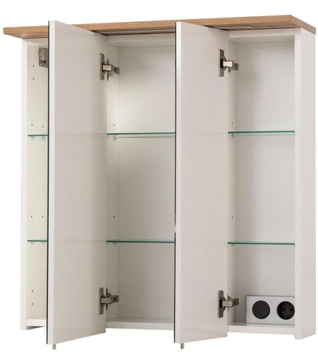 Spiegelschrank »Jelda«, weiß und Eiche-Dekor Farbe: Weiß Oberboden Eiche-Landhaus-Dekor Front verspiegelt Material: Spanplatte, melaminharzbeschichtet Griffe und Beschläge Metall Einlegeböden und Spiegel Glas Maße: B x H x T ca. 70,5 x 72,5 x 16 cm Tiefe Fächer ca. 12 cm Tiefe Oberboden ca. 24 cm Breite LED-Leuchte ca. 40 cm Inhalt: Inkl. Montageanleitung Gewicht: Ca. 20,1 kg Leistung: LED-Leuchte: 5,8 W, 370 Lm, 4.000 k Gebrauchsanweisung: Mit einem feuchten, nicht nassen Tuch reinigen Pflegeprodukte sind nicht notwendig Warnhinweise: Beiliegende Montageanleitung vollständig beachten Sonstige Hinweise: Artikel wird zerlegt geliefert Lieferung in 1 Packstück B x H x T Packstück ca. 100,5 x 42 x 11 cm Hersteller: W. Schildmeyer GmbH & Co. KG Sachsenweg 55, 32547 Bad Oeynhausen info@w-schildmeyer.de Hersteller-Artikel-Nummer: 142296 Mit 3 Türen6 höhenverstellbare EinlegebödenOberboden mit integrierter LED-Leuchte im Aluprofil Inkl. Schalter-Steckdosen-Kombination hinter der rechten TürFür den perfekten Rundumblick lassen die äußeren Türen sich jeweils zur Mitte hin öffnenEiche-Landhaus-Dekor mit fühlbarer HolzstrukturMADE IN GERMANY ...