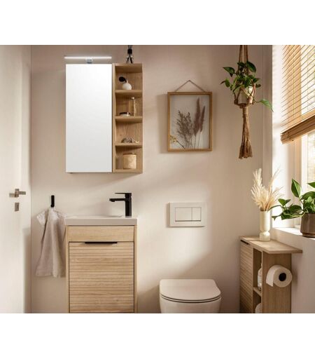 Spiegel »Mads 400« mit offenem Regal Farbe: Korpus Weißeichen-Dekor Rahmen silberfarben Material: Korpus melaminharzbeschichtete Spanplatte Spiegel und Einlegeböden Glas Griff und Beschläge Metall Maße: B x H x T ca. 50 x 74,5 x 16 cm Spiegelfläche ca. 29,5 x 70,5 cm B x H x T offene Fächer je ca. 17,5 x 15,5 x 14 cm Breite Leuchte ca. 30 cm Inhalt: Inkl. Montageanleitung Gewicht: Ca. 12,5 kg Leistung: 5,4 W Gebrauchsanweisung: Mit einem feuchten, nicht nassen Tuch reinigen. Pflegeprodukte sind nicht notwendig Warnhinweise: Beiliegende Montageanleitung vollständig beachten Technische Details: 800 lm, 4.000 K Sonstige Hinweise: Artikel wird zerlegt geliefert Lieferung in 1 Packstück Anlieferung bis zur Haustür Keine Inselbelieferung B x H x T Packstück ca. 31,5 x 11,5 x 92,5 cm Hersteller-Artikel-Nummer: 159670 Hersteller: W. Schildmeyer GmbH & Co. KG, Sachsenweg 55, 32547 Bad Oeynhausen E-Mail: info@w-schildmeyer.de Spiegelschrank mit Tür und offenem RegalTür mit AnschlagdämpfernHinter der Tür 2 höhenverstellbare GlaseinlegebödenRegal rechts oder links am Spiegelschrank montierbarInkl. LED-AufbauleuchteSchalter-Steckdosen-Kombination hinter der TürVielseitig mit weiteren Elementen der Serie kombinierbarEinfache Montage mit verständlicher AufbauanleitungMADE IN GERMANY ...