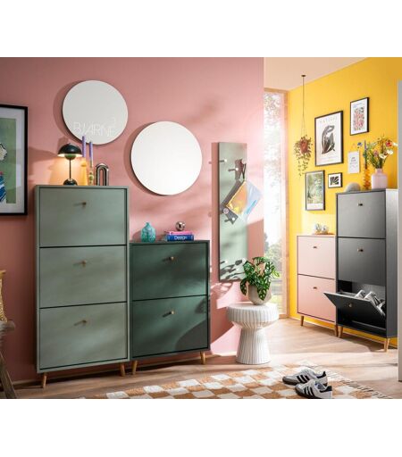 Schuhschrank »Bjarne«, 2 Klappen, apricot Farbe: Apricot Griffe und Füße Eiche naturfarben Material: Melaminharzbeschichtete Spanplatte Griffe und Füße Eichen-Massivholz Beschläge Metall Maße: B x H x T ca. 59,8 x 92,2 x 19,5 cm Klappen je ca. 38 x 55,9 cm Höhe Füße je ca. 10,5 cm Ø Griffe je ca. 2 cm Inhalt: Inkl. Montageanleitung Gewicht: Ca. 16 kg Gebrauchsanweisung: Beiliegende Montageanleitung vollständig beachten Warnhinweise: Mit einem feuchten, nicht nassen Tuch reinigen, Pflegeprodukte sind nicht notwendig Sonstige Hinweise: Artikel wird zerlegt geliefert Lieferung in 1 Packstück Anlieferung frei Haus Keine Inselbelieferung B x H x T Packstück ca. 40 x 10,5 x 89 cm Hersteller-Artikel-Nummer: 160169 Hersteller: W. Schildmeyer GmbH & Co. KG, Sachsenweg 55, 32547 Bad Oeynhausen E-Mail: info@w-schildmeyer.de Optimal für schmale Flure geeignet2 Klappen mit 1-reihigen SchuhtrommelnPlatz für ca. 6 Paar Schuhe bis Schuhgröße 44/45, Schuhlänge ca. 33 cmFüße höhenverstellbar um Unebenheiten im Boden auszugleichenEinfache Montage mit verständlicher AufbauanleitungPlatzsparend durch geringe TiefeGriff und Füße aus MassivholzWandmontage erforderlichMADE IN GERMANY ...