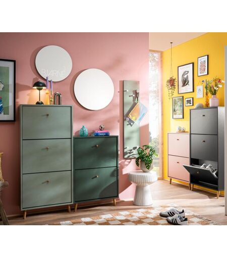 Schuhschrank »Bjarne«, 2 Klappen, anthrazit Farbe: Anthrazit Griffe und Füße Eiche naturfarben Material: Melaminharzbeschichtete Spanplatte Griffe und Füße Eichen-Massivholz Beschläge Metall Maße: B x H x T ca. 59,8 x 92,2 x 19,5 cm Klappen je ca. 38 x 55,9 cm Höhe Füße je ca. 10,5 cm Ø Griffe je ca. 2 cm Inhalt: Inkl. Montageanleitung Gewicht: Ca. 16 kg Gebrauchsanweisung: Beiliegende Montageanleitung vollständig beachten Warnhinweise: Mit einem feuchten, nicht nassen Tuch reinigen, Pflegeprodukte sind nicht notwendig Sonstige Hinweise: Artikel wird zerlegt geliefert Lieferung in 1 Packstück Anlieferung frei Haus Keine Inselbelieferung B x H x T Packstück ca. 40 x 10,5 x 89 cm Hersteller-Artikel-Nummer: 160170 Hersteller: W. Schildmeyer GmbH & Co. KG, Sachsenweg 55, 32547 Bad Oeynhausen E-Mail: info@w-schildmeyer.de Optimal für schmale Flure geeignet2 Klappen mit 1-reihigen SchuhtrommelnPlatz für ca. 6 Paar Schuhe bis Schuhgröße 44/45, Schuhlänge ca. 33 cmFüße höhenverstellbar um Unebenheiten im Boden auszugleichenEinfache Montage mit verständlicher AufbauanleitungPlatzsparend durch geringe TiefeGriff und Füße aus MassivholzWandmontage erforderlichMADE IN GERMANY ...