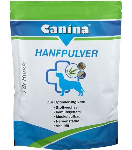 Einzelfuttermittel für HundeCanina® HANF PULVER wird in einem besonders schonenden Herstellungsverfahren aus den Blättern der Hanfpflanze Cannabis sativa gewonnen. Der Hanf enthält von Natur aus wichtige essentielle Aminosäuren und ungesättigte Fettsäuren, die für einen optimalen Stoffwechsel unverzichtbar sind.Das ernährungsphysiologisch ausgewogene Aminosäuremuster in Canina® HANF PULVER unterstützt den Muskelaufbau, das Leistungsvermögen und den Bewegungsapparat. Dies ist besonders für sportlich aktive Hunde wichtig, aber auch junge, ältere oder stressbelastete Hunde in der Rekonvaleszenz profitieren von der besonderen Vielfalt der wertvollen Zusammensetzung: Natürliche Mikromineralien und Vitamine stärken das körpereigene Immunsystem, wertvolle Ballaststoffe tragen zur Darmgesundheit bei.Nicht zuletzt harmonisieren die essentiellen Fettsäuren wie Alpha- und Gamma-Linolensäure den Hormonstoffwechsel, was zum Wohlbefinden des Hundes beiträgt. Nervöse, zur Hyperaktivität neigende Hunde profitieren von den natürlichen ungesättigten Fettsäuren im Canina® HANF PULVER, was sich in mehr Nervenstärke und Stressresistenz ausdrückt.Junghunde, die dazu neigen, Gewicht zu verlieren, können mit Canina® HANF PULVER aufgefüttert werden. Alte Hunde, die zum schnellen Muskelabbau neigen, können mit den wertvollen Aminosäuren in ihrer Muskelkraft unterstützt werden. Vitalität und Wohlbefinden und damit die Lebenqualität der alten Hunde verbessern sich. Als Nebeneffekt hat Canina® HANF PULVER, aufgrund der essentiellen Fettsäuren, einen positiven Einfluss auf die Haarqualität und das Haarwachstum.Canina® HANF PULVER hat keine berauschende Wirkung, da es sich um Futterhanf handelt, der einen nur minimalen THC-Gehalt von ca. 0,07% aufweist (THC = Tetrahydrocannabinol). THC ist für die psychoaktive Wirkung verantwortlich und nur in der weiblichen Hanfpflanze enthalten, die in Canina® HANF PULVER nicht verwendet wird.Canina® HANF PULVER kann ernährungsbedingten Mangelerscheinungen vorbeugen (gleich, was gefüttert wird) und ist ein ernährungsphysiologisch wertvoller Beitrg zur täglichen Ration.Zusammensetzung:Hanfmehl 100% (gemahlene Blätter von Cannabis sativa L.)Zusammensetzung: Rohprotein 29,7%, Fettgehalt 7,1%, Rohfaser 30,3%, Feuchte 10,5%Der Fettgehalt setzt sich wie folgt zusammen:Mehrfach ungesättigte Fettsäuren: Linolsäure 58,26%, Alpha-Linolensäure 19,14%, Gamma-Linolensäure 0,05%Einfach ungesättigte Fettsäuren: Palmitoleinsäure 0,10%, Ölsäure 11,61%, Gadoleinsäue 0,41%,Gesättigte Fettsäuren: Myristinsäure 0,10%, Palmitinsäure 6,28%, Stearinsäure 2,72%, Arachinsäure 0,88%, Behensäure 0,33%, Lignocerinsäure 0,15%,Fütterungsempfehlung pro Tier und Tag:3g pro 10kg Körpergewicht, max. 30g(3g = ca. 1 Teelöffel)Canina® HANF PULVER wird dem täglichen Futter beigemischt, ganz gleich, ob Trocken-, Feuchtfutter oder selbst zubereitete Rationen... ...