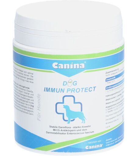 Ergänzungsfuttermittel zur Unterstützung der Abwehrkräfte bei Hunden Besonders zu empfehlen für Welpen und Mutterhündin, alte bzw. kranke Hunde und Leistungshunde! Dog Immum Protect enthält wertvolle Ei-Immunglobuline. Mutterhündin:bei Milchmangel des Muttertieres nach der Geburt (zu wenig Kolostrum) zum Aufbau der Schutzstoffe die in der Kolostralmilch enthalten sind, dies führt zur Verbesserung der Kolostrum-QualitätWelpen:zur Reduktion der Welpenverluste, d.h. eine geringere Sterberate der Welpen zur Verbesserung des Wachstums der Welpen zur Unterstützung von Welpen mit niedrigem Geburtsgewicht, insbesondere bei unzureichender Kolostrumaufnahme oder fehlendem Kolostrum durch Verlust bzw. Krankheit der Hündin, oder aufgrund eines großen Wurfes (Zufütterung bereits ab dem 2. Lebenstag) zur Verbesserung der Widerstandskraft und zur Stärkung des Immunsystems der WelpenAusgewachsene und Leistungshunde:zum Schutz vor Irritationen des Magen- Darmtraktes zur Steigerung der Vitalität bei alten und/oder kranken Hunden zur Stärkung des Immunsystems in Stresssituationen wie Reise, Pensionsaufenthalt, Ausstellung, sportliche Leistungen um das darmassoziierte Immunsystem nach Entwurmungskuren und Antibiotikatherapien zu stärken und das mikrobiologische Gleichgewicht der Darmflora wieder herzustellenZusammensetzung:Volleipulver, Hefe, aufgeschlossene WeizenstärkeRohprotein 32,0%, Rohfett 14,0%, Rohasche 3,7%, Rohfaser 1,1%Analytische Bestandteilen je kg:3x 10^9KBE/kg Enterococcus faecium NCIMB 10415 EG-Nr. 10Fütterungsempfehlung pro Tier und Tag:Welpen ab dem 2. Lebenstag:1 Messerspitze (ca. 1g) --> Empfehlung: vermischt mit Canina's WelpenmilchWelpen und Junghunde vom 14. Lebenstag bis zum 9. Lebensmonat:1 Teelöffel (ca. 4g)Erwachsene Hunde, Mutterhündin, alte/kranke Hunde, Leistungshunde:bis 10kg Körpergewicht 1 Teelöffel bis 25kg Körpergewicht 2 Teelöffel über 25kg Körpergewicht 3 Teelöffel ...