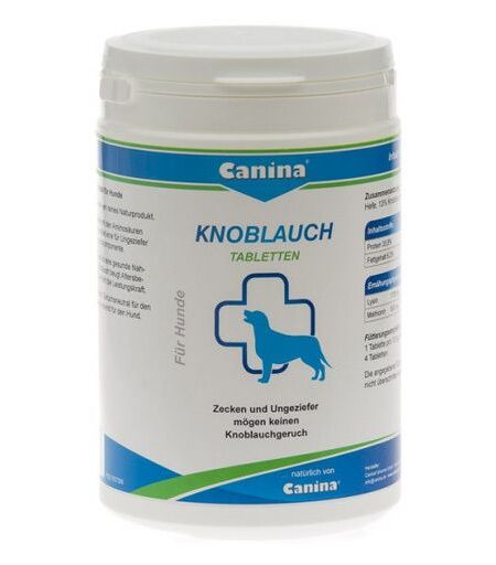 Ergänzungsfuttermittel für HundeKnoblauchgeruch gegen Zecken und Ungeziefer!Canina's Knoblauch ist ein reines Naturproduktdie Aminosäuren Methionin und Lysin bilden eine für Ungeziefer unangenehme Geruchskomponente beugt Altersbeschwerden vor und erhöht die Leistungskraftist für den Menschen geruchsneutralwohlschmeckend für den HundappetitanregendZusammensetzung:Knoblauch, 13% Hefe, Fischmehl, SeealgenZusammensetzung:35,8% Rohprotein, 24,5% Rohasche 6,2% Rohfett, 0,7% RohfaserFütterungsphysiologische Analytische Bestandteile je kg:3,0% Lysin, 0,5% MethioninFütterungsempfehlung pro Tier und Tag:1 Tablette pro 10 kg Körpergewicht, maximal 4 Tabletten.Die angegebene Fütterungsempfehlung darf nicht überschritten werden. ...