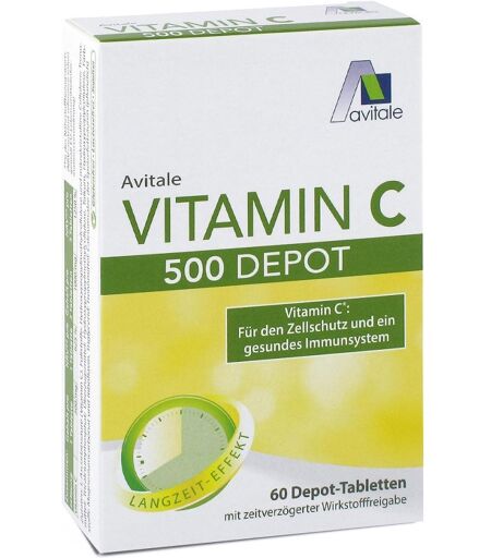 Anwendungsgebiet von Vitamin C 500 mg Depot TablettenVitamin C 500 mg Depot Tabletten sind ein Nahrungsergänzungsmittel mit 500 mg Vitamin C. Depot-Tabletten mit zeitverzögerter Wirkstofffreigabe. Vitamin C ist ein lebensnotwendiges, wasserlösliches Vitamin. Der Körper kann es weder selbst bilden noch lange speichern. Vitamin C 500 mg Depot Tabletten enthält pro Tablette 500 mg Vitamin C, das über Stunden zeitverzögert an den Organismus abgegeben wird. Dadurch steht es dem Körper zur Unterstützung wichtiger Stoffwechselprozesse und zur körperlichen Abwehr länger zur Verfügung. Vitamin C* ist wichtig für viele Körperfunktionen: Es trägt zur normalen Funktion des Immunsystems, auch während und nach intensiver körperlicher Betätigung, und zum Schutz der Zellen vor oxidativem Stress bei*. Es leistet einen Beitrag zur normalen Funktion des Nervensystems und zur normalen psychischen Funktion. Es unterstützt den Energiestoffwechsel, verringert Müdigkeit und Ermüdung und erhöht die Eisenaufnahme. Es trägt zu einer normalen Kollagenbildung für eine normale Funktion der Knorpel und Knochen, der Zähne und des Zahnfleisches sowie der Haut bei. Das Produkt ist ein Nahrungsergänzungsmittel und wird von einem deutschen zertifizierten Arzneimittelhersteller produziert. Avitale Vitamin C 500 Depot ist glutenfrei, laktosefrei sowie sojafrei.Wirkstoffe / Inhaltsstoffe / ZutatenZutaten von Vitamin C 500 mg Depot Tabletten: L-Ascorbinsäure (Vitamin C), Füllstoffe: Hydroxypropylmethylcellulose und mikrokristalline Cellulose Trennmittel: Tricalciumphosphat Überzugsmittel: Hydroxypropylmethylcellulose, Talkum, Hydroxypropylcellulose, Farbstoffe Magnesiumcarbonat und Riboflavin, Triglycerid Trennmittel: Calciumsalze der Speisefettsäuren (pflanzlich) 1 Depot-Tablette enthält: 500 mg Vitamin C (625% NRV*) 2 Depot-Tabletten enthalten: 1000 mg Vitamin C (1.250% NRV*) NRV* = % des N� ...
