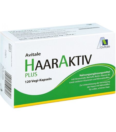 Anwendungsgebiet von Haaraktiv Plus Vegi KapselnHaaraktiv Plus Vegi Kapseln sind ein Nahrungsergänzungsmittel und unterstützen die Versorgung der Haarwurzel mit wichtigen Nährstoffen. Sie sind ein sinnvoller Beitrag für kräftiges und schönes Haar.Wirkungsweise von Haaraktiv Plus Vegi Kapseln Der hohe Mineralstoffgehalt in den 210 mg Hirseextrakt pro Kapsel sorgt für eine optimale Nährstoffversorgung der Haarwurzel. Biotin, das H(aar) – Vitamin bildet u.a. das Protein Keratin, die Grundsubstanz für Haare und Nägel. Biotin wird oft auch als Schönheitsvitamin bezeichnet. Vitamin B5 – Pantothensäure und andere B-Vitamine unterstützen den Stoffwechsel und somit eine schöne, lebendige Haarentwicklung positiv. Vitamin E sorgt für eine wohltuende Durchblutung der Kopfhaut. Vitamin A unterstützt die Teilung der Haarzellen, dies kann zu einem stärkeren Haarwachstum führen. Wirkstoffe / Inhaltsstoffe / ZutatenZutaten von Haaraktiv Plus Vegi Kapseln: Hirse Extrakt, Kapselhülle: Hydroxypropylmethylcellulose, BIERHEFE, VITAMIN E (α-Tocopherol), Vitamin B3 (Nicotinamid), Trägerstoff: Maltodextrin, Zink, Vitamin B5 (Pantothensäure), Trennmittel: Tri-Calciumphosphat und Magnesiumsalze von Speisefettsäuren, Vitamin A (Retinol), Vitamin B6 (Pyridoxin), Kupfer, Vitamin D3 (Cholecalciferol), Vitamin B9 (Folsäure), Vitamin H (Biotin) Nährwerte pro Kapsel: 210mg Goldhirse Extrakt 76,75mg Bierhefe 30mg Vitamin E (α-Tocopherol) 24mg Vitamin B3 (Nicotinamid) 11mg Vitamin B5 (Pantothensäure) 5mg Zink 400mcg Vitamin A (Retinol) 200mcg Vitamin B9 (Folsäure) 150mcg Vitamin H (Biotin) 2,5mcg Vitamin D3 (Cholecalciferol) 1,4mg Vitamin B6 (Pyridoxin) 0,5mg KupferGegenanzeigenBei bekannter Überempfindlichkeit gegen einen der oben genannten Inhaltsstoffe sollte das Produkt nicht verwendet werden. DosierungVerz ...
