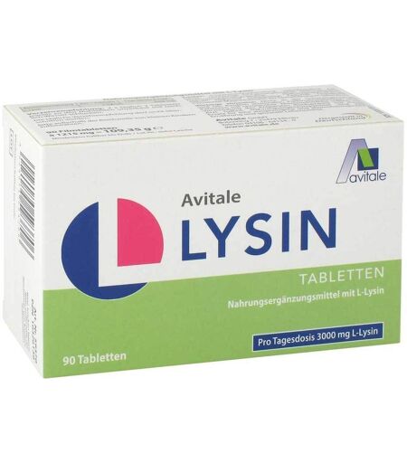 Nahrungsergänzungsmittel sind kein Ersatz für eine ausgewogene und abwechslungsreiche Ernährung und eine gesunde Lebensweise. Avitale L-Lysin 750 mg Die Aminosäure L-Lysin kann die Aufnahme ihres Gegenspielers L-Arginin im menschlichen Körper reduzieren. L-Arginin wird vom Herpes simplex Virus jedoch für dessen Vermehrung benötigt. Die tägliche Zufuhr von 3g L-Lysin kann daher bei wiederkehrenden Herpes simplex Infektionen ernährungsphysiologisch und im Rahmen eines Diätmanagements sinnvoll sein.Zutaten: L-Lysinmonohydrochlorid, mikrokristalline Cellulose, Trennmittel: Tri-Calciumphosphat, Überzugsmittel: Hydroxypropylmethylcellulose, Hydroxypropylcellulose, Talkum, Triglycerid (mittelkettig), Farbstoff: ; Trennmittel: Magnesiumsalze von Speisefettsäuren.Nährwerte: Zusammensetzung pro Kapsel L-Lysin 750 mg Brennwert 16 kJ / 3,77 kcal Fett 0,01 g davon gesättigte Fettsäuren 0,01 g Kohlenhydrate < 0,1 g davon Zucker < 0,1 g Eiweiß < 0,1 g Salz 0,0 g Verzehrempfehlung:2 Mal täglich 2 Tabletten jeweils zu den Mahlzeiten unzerkaut mit reichlich Wasser schlucken.Hinweis:Die angegebene empfohlene Tagesmenge darf nicht überschritten werden.Aufbewahrung: Kühl und trocken unter 25°C lagern.Nettofüllmenge:90 Tabletten / 108,9 g Hersteller Avitale by Mikro-Shop Handels GmbH Carl-Zeiss-Straße 8 25451 Quickborn ...