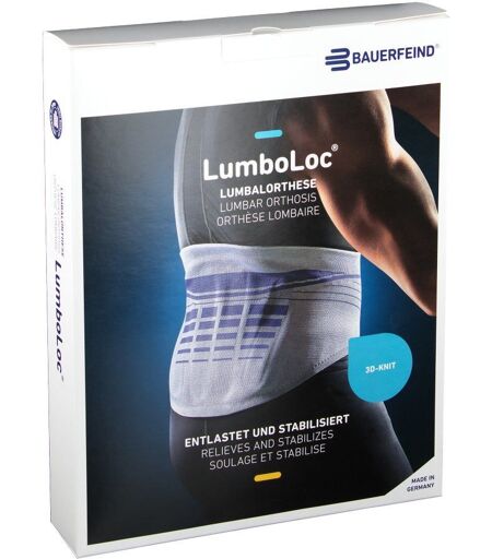 LumboLoc®Stabilorthese zur Entlastung der LendenwirbelsäuleBei Schmerzen in der Lendenwirbelsäule (LWS-Syndrom) oder mittelstarker Muskelschwäche richtet LumboLoc die Lendenwirbelsäule auf und entlastet die Bandscheiben.Hinten stützen anatomisch vorgeformte Korsettstäbe in der Orthese den Rücken, von vorne wirkt ein individuell einstellbarer Kompressionsdruck auf die Lendenwirbelsäule ein. LumboLoc kann einfach auf die individuelle Körperform angepasst werden und sitzt dadurch perfekt.Individuell formbar für perfekten SitzLeicht, elastisch und atmungsaktivEin starker Partner gegen RückenschmerzenStützen statt SchmerzenVier Aluminiumstäbe im Rückenteil der LumboLoc richten die Lendenwirbelsäule auf und unterstützen sie dabei, eine anatomisch korrekte und damit schmerzfreie Haltung einzunehmen. Sie können noch nachgeformt werden, wenn die individuelle Anatomie es erfordert.Durch den Klettverschluss vorn kann die Stärke der Druckwirkung auf den Bauchraum und damit indirekt die Entlastung der Lendenwirbelsäule individuell gesteuert werden.Sicherheit und KomfortLumboLoc sitzt dank seiner anatomischen Passform stets bequem; das elastische, atmungsaktive Material liegt perfekt am Körper an. Praktische Handschlaufen erleichtern die Handhabung, so dass LumboLoc schnell und einfach angelegt werden kann. Damit ist die Orthese ein unsichtbarer aber starker Partner gegen Rückenschmerzen.HauptindikationenDegeneration/ muskuläre Insuffizienz der Wirbelsäule (mittelstark)LWS-SyndromBegleitindikationenFacettensyndrom GrößeUmfang 170-80 280-90 390-100 4100-110 5110-120 6120-130PflegehinweiseWir empfehlen LumboLoc® bei 30° C mit einem Feinwaschmittel separat per Hand zu waschen.Um die Funktionsfähigkeit der Klettverschlüsse lange Zeit zu erhalten, und um Beschädigungen zu vermeiden, empfehlen wir, diese vor der Wäsche zu schließen.Beim Trocknen nicht direkter Hitze (z. B. Heizkörper, Sonneneinstrahlung usw.) aussetzen. ...