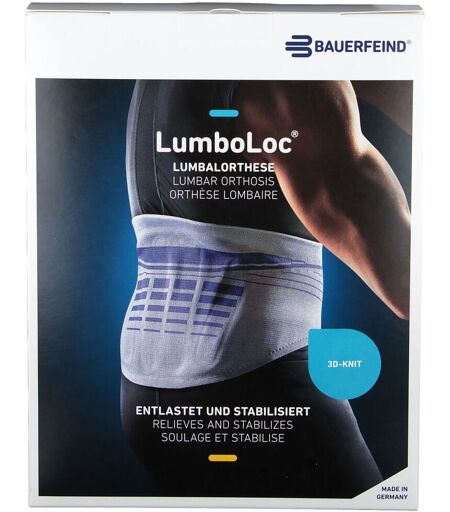 LumboLoc®Stabilorthese zur Entlastung der LendenwirbelsäuleBei Schmerzen in der Lendenwirbelsäule (LWS-Syndrom) oder mittelstarker Muskelschwäche richtet LumboLoc die Lendenwirbelsäule auf und entlastet die Bandscheiben.Hinten stützen anatomisch vorgeformte Korsettstäbe in der Orthese den Rücken, von vorne wirkt ein individuell einstellbarer Kompressionsdruck auf die Lendenwirbelsäule ein. LumboLoc kann einfach auf die individuelle Körperform angepasst werden und sitzt dadurch perfekt.Individuell formbar für perfekten SitzLeicht, elastisch und atmungsaktivEin starker Partner gegen RückenschmerzenStützen statt SchmerzenVier Aluminiumstäbe im Rückenteil der LumboLoc richten die Lendenwirbelsäule auf und unterstützen sie dabei, eine anatomisch korrekte und damit schmerzfreie Haltung einzunehmen. Sie können noch nachgeformt werden, wenn die individuelle Anatomie es erfordert.Durch den Klettverschluss vorn kann die Stärke der Druckwirkung auf den Bauchraum und damit indirekt die Entlastung der Lendenwirbelsäule individuell gesteuert werden.Sicherheit und KomfortLumboLoc sitzt dank seiner anatomischen Passform stets bequem; das elastische, atmungsaktive Material liegt perfekt am Körper an. Praktische Handschlaufen erleichtern die Handhabung, so dass LumboLoc schnell und einfach angelegt werden kann. Damit ist die Orthese ein unsichtbarer aber starker Partner gegen Rückenschmerzen.HauptindikationenDegeneration/ muskuläre Insuffizienz der Wirbelsäule (mittelstark)LWS-SyndromBegleitindikationenFacettensyndrom GrößeUmfang 170-80 280-90 390-100 4100-110 5110-120 6120-130PflegehinweiseWir empfehlen LumboLoc® bei 30° C mit einem Feinwaschmittel separat per Hand zu waschen.Um die Funktionsfähigkeit der Klettverschlüsse lange Zeit zu erhalten, und um Beschädigungen zu vermeiden, empfehlen wir, diese vor der Wäsche zu schließen.Beim Trocknen nicht direkter Hitze (z. B. Heizkörper, Sonneneinstrahlung usw.) aussetzen. ...