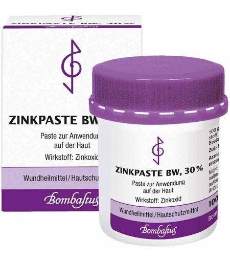 Anwendungsgebiet von Zinkpaste BwDas Präparat ist ein Wundheilmittel/Hautschutzmittel.Diese Paste wird angewendet zur Abdeckung bzw. zum Schutz der gesunden Haut und zur Sekretbindung bei nässenden akuten und subakuten Dermatosen (Hautkrankheiten).Wirkstoffe / Inhaltsstoffe / Zutaten30 g Zink oxidVaselin, gelb Hilfstoff (+)GegenanzeigenDieses Arzneimittel darf nicht angewendet werden,wenn Sie überempfindlich (allergisch) gegen Zinkoxid oder den sonstigen Bestandteil sind.DosierungWenden Sie das Arzneimittel immer genau nach der Anweisung an. Bitte fragen Sie bei Ihrem Arzt oder Apotheker nach, wenn Sie sich nicht ganz sicher sind.Soweit nicht anders verordnet, wird das Arzenimittel einmal oder mehrmals täglich auf die betroffenen Hautflächen aufgetragen.Das enthaltene Zinkoxid kann sich in der Wäsche festsetzen und ist dann nur schwer wieder zu entfernen. Decken sie daher die mit der Paste behandelte Hautfläche mit einer Mullkompresse, einem Pflaster oder einem Verband ab. Dauer der AnwendungDie Dauer der Anwendung ist prinzipiell nicht begrenzt.Bitte sprechen Sie mit Ihrem Arzt oder Apotheker, wenn Sie den Eindruck haben, dass die Wirkung zu stark oder zu schwach ist. Wenn Sie eine größere Menge des Arzneimittels angewendet haben, als Sie solltenund sich aufgrund der höheren Dosis Beschwerden einstellen, benachrichtigen Sie bitte Ihren Arzt. Dieser kann gegebenenfalls über erforderliche Maßnahmen entscheiden. Möglicherweise tritt die unter Nebenwirkungen aufgeführte Nebenwirkung verstärkt auf.EinnahmeDas enthaltene Zinkoxid kann sich in der Wäsche festsetzen und ist dann nur schwer wieder zu entfernen. Decken sie daher die mit der Paste behandelte Hautfläche mit einer Mullkompresse, einem Pflaster oder einem Verband ab.PatientenhinweiseBesondere Vorsicht bei der Anwendung dieses Arzneimittels ist erforderlich,wenn die unter Kategorie "Indikation" beschriebenen Beschwerden verstärkt auftreten. Fragen Sie in diesem Fall Ihren Arzt oder Apotheker.� ...