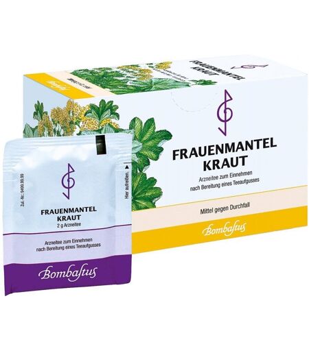 Anwendungsgebiet von FRAUENMANTELKRAUT BOMBASTUSFRAUENMANTELKRAUT BOMBASTUS ist ein pflanzliches Magen-Darm-Mittel, das bei unspezifischen leichten Durchfallerkrankungen angewendet wird. FRAUENMANTELKRAUT BOMBASTUS wird als Tee zubereitet und bietet so eine angenehme Anwendung.Wirkungsweise von FRAUENMANTELKRAUT BOMBASTUSDer in FRAUENMANTELKRAUT BOMBASTUS enthaltene Frauenmantel ist eine Arzneipflanze, die bei leichten Darmbeschwerden empfohlen wird. Frauenmanteltee verhindert ein Zusammenziehen der Darmschleimhaut und stoppt so die übermäßige Abgabe von Flüssigkeit in den Darm.Wirkstoffe / Inhaltsstoffe / Zutaten1 Aufgussbeutel von FRAUENMANTELKRAUT BOMBASTUS enthält: 2 g Frauenmantelkraut GegenanzeigenBei bekannter Überempfindlichkeit gegen einen der Inhaltsstoffe sollte dieses Produkt nicht angewendet werden.DosierungAnwendungsempfehlung von FRAUENMANTELKRAUT BOMBASTUS: Wenn nicht anders verordnet trinken Sie 3-5 mal täglich 1 Tasse. Zur Zubereitung von FRAUENMANTELKRAUT BOMBASTUS übergießen Sie einen Filterbeutel mit ca. 150 ml siedendem Wasser. Anschließend zugedeckt etwa 10-15 Minuten ziehen lassen. FRAUENMANTELKRAUT BOMBASTUS können in Ihrer Versandapotheke www.juvalis.de erworben werden. ...