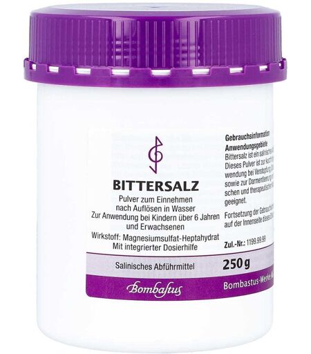 Anwendungsgebiet von BITTERSALZ BOMBASTUSDas Präparat ist ein salinisches Abführmittel.Dieses Pulver ist zur kurzfristigen Anwendung bei Verstopfung (Obstipation) sowie zur Darmentleerung vor diagnostischen und therapeutischen Maßnahmen geeignet.Wirkstoffe / Inhaltsstoffe / Zutaten100 g Magnesium sulfat 7-Wasser9.86 g Magnesium IonGegenanzeigenDieses Arzneimittel darf nicht angewendet werden,wenn Sie überempfindlich (allergisch) gegen Magnesiumsulfat-Heptahydrat sind,bei Darmverschluss,bei eingeschränkter Nierenfunktion.Es sollte nicht angewendet werden beientzündlichen Magen-Darm-Erkrankungen sowieStörungen des Wasser- und Elektrolythaushalts.DosierungNehmen Sie das Präparat immer genau nach der Anweisung ein. Bitte fragen Sie bei Ihrem Arzt oder Apotheker nach, wenn Sie sich nicht ganz sicher sind.Soweit nicht anders verordnet, trinken Erwachsene 2 bis 3 Teelöffel voll (10 bis 15 g) Pulver in ca. 250 ml Wasser gelöst.Für eine rasche Darmentleerung werden 1 bis 2 Esslöffel voll (20 bis 30 g) Pulver in ca. 500 ml Wasser gelöst getrunken.Kinder über 6 Jahre erhalten die halbe Dosis. Dauer der AnwendungDas Arzneimittel soll nur kurzfristig angewendet werden. Eine längerfristige Anwendung führt zu einer Verstärkung der Darmträgheit.Bitte sprechen Sie mit Ihrem Arzt oder Apotheker, wenn Sie den Eindruck haben, dass die Wirkung zu stark oder zu schwach ist. Wenn Sie eine größere Menge des Arzneimittels angewendet haben, als Sie solltenund sich aufgrund der höheren Dosis Beschwerden einstellen, benachrichtigen Sie bitte Ihren Arzt. Dieser kann gegebenenfalls über erforderliche Maßnahmen entscheiden. Möglicherweise treten die unter Nebenwirkungen aufgeführten Nebenwirkungen verstärkt auf.Bei Überdosierung von dem Präparat kann es zum Entzug von Wasser mit Elektrolytstörungen und zur Magnesiumvergiftung kommen.Die Therapie hat sich an den Symptomen zu orientieren.EinnahmeSoweit nicht anders verordnet, trinken Erwachsene 2 bis 3 Teelöffel voll ...