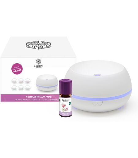 Aromastream Mini mit BALDINI Welness Genießen Sie die wohltuende und zugleich belebende Kraft der Raumbeduftung! Aromastream Mini ist der akkubetriebene Duftbegleiter für Unterwegs. Durch das mitgelieferte USB Kabel lässt sich der Akku unkompliziert wieder aufladen. Es empfiehlt sich, pro Duft immer ein eigenes Vlies zu verwenden. Nur wenige Tropfen der beigefügten Baldini Duftkomposition Wellness reichen für eine angenehm natürliche Beduftung aus. Maße Ø 10 cm • Höhe 6 cm • Ideal zur Beduftung am Schreib- oder Nachttisch 10 Ersatzvliese enthalten! Anwendung Wenige Tropfen ätherisches Öl auf die beiliegenden Vliese geben, um den Raum angenehm zu beduften. Es empfiehlt sich je unterschiedlichem Duft ein eigenes Vlies zu nehmen. ...