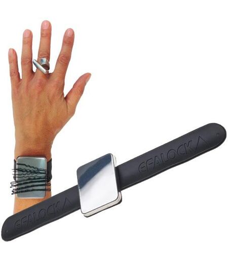 Magnet-Armband mit Snap-On-Technik für Haarnadeln und -klemmen. Die Magnetfläche erweist sich als intelligentes Hilfsmittel um Haarnadeln und Haarklemmen jederzeit griffbereit zu haben. Das ca. 24 cm lange Armband lässt sich in Sekundenschnelle an- und wieder abstreifen. Wenn Sie das Armband leicht biegen rundet es sich zu einem Ring zusammen und "schnappt zu". Es hält von alleine ohne zusätzlichen Verschluss. ...