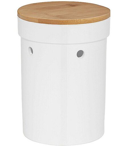 Wer kennt das nicht – oftmals liegen die gekauften Zwiebeln noch in ihrem Netz, offen in einem Eimer oder in einer provisorischen Ablage im Keller, in der Küche oder in der Vorratskammer. Mit dem Zwiebeltopf Salena kommt nun mehr Ordnung ins Spiel. Luftlöcher im Topf sorgen dabei für längere Frische. Ein schöner Bambusdeckel rundet das Design schön ab und sorgt für den natürlichen Look des Zwiebeltopfs. Zwiebeltopf Salena aus Keramik mit Deckel aus Bambus. Ø 15 cm, Höhe 20,5 cm. Der Bambusdeckel ist nicht spülmaschinengeeignet! ...
