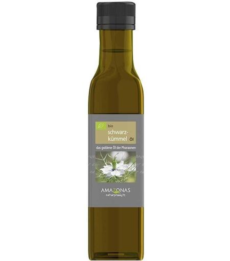 Bitte achten Sie auf eine abwechslungsreiche und ausgewogene Ernährung und gesunde Lebensweise.AMAZONAS Schwarzkümmel Öl Bio AMAZONAS BIO Schwarzkümmelöl ist ein 100 % reines Öl aus Erstpressung und enthält einen hohen Anteil an mehrfach ungesättigten Fettsäuren und natürlichem Vitamin E. Kaltgepresstes BIO Schwarzkümmelöl, nigella sativa“ aus Ägypten, garantiert höchste Qualität. Eine schonende Stempelpressung sorgt dafür, dass alle wichtigen Inhaltsstoffe erhalten bleiben. Schwarzkümmel war bereits im alten Ägypten bekannt aufgrund seiner vielfältigen Einsatzmöglichkeiten.Zutaten: Reines, kaltgepresstes Schwarzkümmelöl aus kontrolliert biologischem Anbau, gewonnen aus ägyptischen Schwarzkümmelsamen. Nährwerte: Durchschnittliche Nährwerte pro 100 g Brennwert 3.429 kJ / 819 kcal Fett 98,4 g - dav. ges. Fettsäuren 11,9 g Enthält Spuren von Kohlenhydraten, Zucker, Eiweiß, Salz Broteinheiten in der Tagesempfehlung (6 ml) 0 BE Verzehrsempfehlung: Täglich 6 ml Öl (= ca. 2 Teelöffel) in ein beliebiges Getränk, unter Salate oder Vorspeisen mischen. Hinweis:Die angegebene empfohlene Tagesmenge darf nicht überschritten werden. Aufbewahrung:Kühl (6-25 °C) und lichtgeschützt lagern. Außerhalb der Reichweite von Kindern aufbewahren.Nettofüllmenge: 250 ml ÖlHersteller: AMAZONAS Naturprodukte Handels GmbHHelmholtzstr. 8268723 Schwetzingen ...