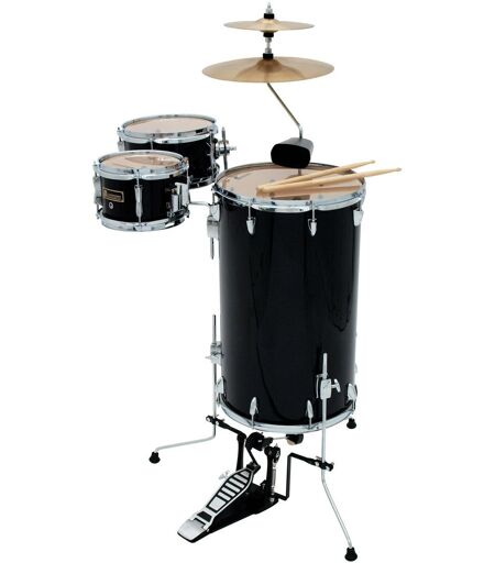 5-teiliges Cocktail Schlagzeug Set, ideal für kleine Bühnen Unterfütterte Böckchen, Lieferumfang 1 x Snare-Drum, 1 x Floortom, 1 x Tom Tom, 1 x Schlüssel, 2 x Drumstick, 3 x Becken, 2 x Innensechskantschlüssel, 1 x Fußmaschine, 3 x Fuß, 1 x Instrument, 1 x Gestell, Metallteile: Verchromt, Hardware: Komplett, Farbe: Schwarz, Trommeln: Snare-Drum 8" x 5,5"Tom 10" x 5"Floortom 15" x 25", Gewicht: 17,70 kg ...