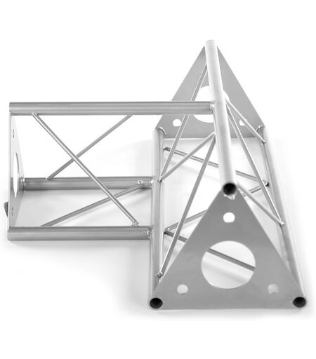 DECOTRUSS 3-Punkt Traversensystem: Bei DECOTRUSS handelt es sich um ein 3-Punkt Traversensystem aus Stahl, das über drei M10 Schrauben/Muttern verbunden wird. Der Vorteil dieser Schraubverbindung besteht darin, dass bei Verlust einzelner Verbinder schnell auf Baumarktware ausgewichen werden kann. Die drei Gurtrohre sind aus 15 mm Stahlrohr mit 1,5 mm Wandstärke gefertigt und eignen sich dadurch nur zu dekorativen Zwecken. Mit seinen minimalen Außenmaßen von 150 mm eignet sich DECOTRUSS ideal zum Gestalten von Design-Elementen im Dekorationsbereich von Privathäusern oder auf Messeständen, im Ladenbau, Diskotheken- und Theatereinrichtungen. Bei diesem Traversensystem handelt es sich um ein reines Dekorationssystem, das durch kompakte Maße, niedrigen Lageraufwand und einfachen Transport überzeugt.. Bitte beachten Sie: Dieses Traversensystem darf niemals mit anderen Systemen kombiniert werden und es sind keine Verbinder im Lieferumfang enthalten!: Das dekorative Trussing: Leichte Montage, Die DECOTRUSS Elemente werden über die Verbindungsplatten mit drei M10 Schrauben verschraubt, Durch eine Vielzahl von Traversen und Ecken lassen sich phantasievolle Raumgebilde erstellen, DECOTRUSS eignet sich zum Gestalten von Design-Elementen im z. B. im Ladenbau, auf Messeständen, DECOTRUSS ist in silberner Lackierung erhältlich , DECOTRUSS Konstruktionen sind als Design-Element gedacht, Bitte beachten Sie die für Traversen-Konstruktionen geltenden gesetzlichen Richtlinien ...
