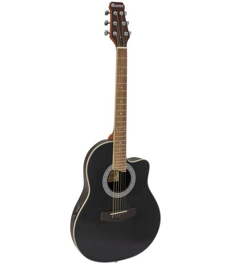 Akustische Gitarre mit Piezo-Tonabnehmer Vorverstärker mit 3-Band-Equalizer und Präsenz-Regler, Lieferumfang 1 x Instrument, 1 x Batterie, 1 x Innensechskantschlüssel, Batterie: 1 x 9,0 V E-Block 6F22 Zink-Kohle beiliegend, Tonabnehmer: Mit Pre-Amp und Stimmgerät, Ausführung: Rechtshänderversion, Hals: NatoGriffbrett: Walnuss 21 Bünde, Korpus: 4/4 Rounded back mit Cutaway-Form, Steg: Ahorn, Saitenanzahl: 6, Regler: 1 x Lautstärke, 3 x Ton, Equalizer: Regler 4-Band, Decke: Fichte, Hardware: Verchromt, Farbe: Schwarz, geflammt, Gewicht: 2,30 kg ...
