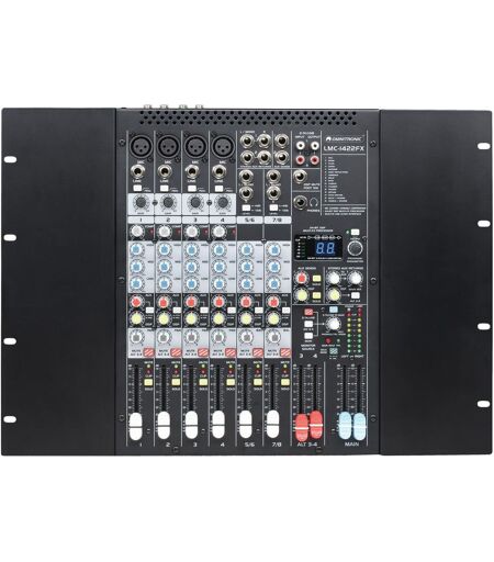 Professionelle Live-Mischpulte mit British-EQ, Effekteinheit und USB-InterfaceMühelos für den richtigen Sound sorgen der LMC-Serie von OMNITRONIC! Die außerordentlich einfach zu bedienenden Kompaktmischer verfügen über einen warmen, absolut unverfälschten Klang mit hervorragenden Audioparametern, umfangreicher Ausstattung und höchster Zuverlässigkeit - ideal für professionelle Live-Auftritte, Studioaufnahmen und als festinstallierter PA-Mischer. Insbesondere das 2022FX besitzt mehrere nützliche Features, die in dieser Preisklasse einzigartig sind: Feedback-Erkennung, Voice Canceller und 3D-Stereo-Surround-Sound.In den Mono-Kanalzügen sind serienmäßig extrem rauscharme Mikrofon-Preamps in Studioqualität verbaut, die beeindruckende 130 dB Dynamikumfang bieten und mit einer Bandbreite von unter 10 Hz bis über 200 kHz eine kristallklare Wiedergabe ermöglichen. In allen Kanalzügen befinden sich angenehm warm klingende Equalizer, die auf klassischen British-EQ-Schaltungen von Mischkonsolen der 60er und 70er Jahre basieren. Außerdem verfügen alle Pulte über Ein-Knopf-Kompressoren in den Mono-Kanälen und einen 24-Bit-FX-Prozessor zum Zumischen von 16 editierbaren Effekten, die auf einzelne Kanäle, Busse oder den Main Mix geroutet werden können. Dank des integrierten USB-Audio-Interfaces mit einer max. Abtastrate von 48 kHz lässt sich jede Session schnell und einfach auf dem Computer aufnehmen.PRO Audiomischpult mit British-style EQ, Kompressor, Effekteinheit und USB-Schnittstelle 4 Mono-Eingangskanäle mit Gain-Regler, 3-Band-EQ, Low Cut und Pan-Regler, 2 Stereo-Eingangskanäle mit 3-Band-EQ, Pegelanpassung und Balance-Regler, Hochwertige, rauscharme Mikrofonvorverstärker mit 130 dB Dynamikumfang und hoher Aussteuerungsreserve, Exzellente Equalizer mit British-EQ-Schaltung für warmen und musikalischen Klang, Einfach zu bedienende Ein-Knopf-Kompressoren in Studioqualität mit Kontroll-LED in allen Mono-Kanalzügen, 24-Bit-DSP-Effekteinheit mit 16 editierbaren Effekten, Tap-Funktion und speicherbaren Benutzereinstellungen, Integriertes USB-Audio-Interface erlaubt Aufnahmen und Wiedergabe mit einem Computer (PC und Mac), 2 AUX Sends pro Kanal: AUX 1 pre-fader/post-fader schaltbar für externe Effekte oder Monitoring, AUX 2 post-fader für interne Effekte, ALT 3-4 Stereo-Bus mit separaten Fadern und Ausgängen für zusätzliche Routing-Möglichkeiten, 2 Stereo AUX Returns als zusätzliche Line-Eingänge nutzbar, Clip-LEDs und Routing-Schalter für Mute und Solo/PFL in allen Kanalzügen, Symmetrische Summenausgänge über goldbeschichtete XLR-Buchsen, Monitor- und Kopfhörer-Ausgänge mit flexiblem Eingangsrouting, CD/Tape-Eingang mit Routing-Möglichkeit auf Summen- oder Monitor-/Kopfhörer-Ausgänge, CD/Tape-Ausgang, Präzise 8-stellige LED-Pegelanzeige, Effektprozessor über externen Fußschalter fernsteuerbar, +48 V Phantomspeisung, zentral zuschaltbar, Einfarbiges 2 stelliges 7-Segment-LED Display, Das Gerät lässt sich über USB mit dem PC verbinden,, (19") 48,3 cm Rackeinbau... ...