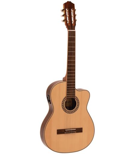 Thinline-Klassikgitarre mit Tonabnehmersystem Schmaler Korpus, Lieferumfang 1 x Instrument, 1 x Innensechskantschlüssel, 1 x Batterie, Batterie: 1 x 9,0 V E-Block 6F22 Zink-Kohle eingebaut, Tonabnehmer: 1 x Piezo, Hals: MahagoniGriffbrett: Walnuss 19 Bünde, Korpus: 4/4Hainbuche lackiert, Mensur: 650 mm, Sattelbreite: 52 mm, Steg: Ahorn, Saitenanzahl: 6, Regler: 1 x Lautstärke, 2 x Ton, Equalizer: 1 x Regler 2-Band, Binding: Vorderseite und Rückseite schwarz, Pinstripe, Decke: Kiefer massiv, Farbe: Natur, Gewicht: 1,75 kg ...