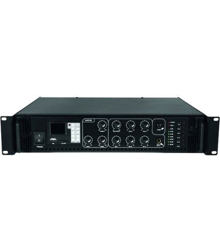 Hinweis: Bei den Artikeln der Fundgrube handelt es sich um Restposten oder Artikel aus Kundenretouren. Diese Artikel sind nur in begrenzter Stückzahl vorhanden, voll funktionstüchtig aber teilweise ohne Originalverpackung. Sollten Sie Fragen zu dem hier abgebildeten Produkt haben, kontaktieren Sie uns bitte vor Ihrem Kauf, um mögliche Unstimmigkeiten zu vermeiden.: Wir informieren sie gerne. Bemerkungen zum Artikel: Artikel aus der Kundenretoure: leichte Gebrauchsspuren: Enorme Zuverlässigkeit bei maximaler Flexibilität Der Omnitronic MPZ-650.6P ELA-Mischverstärker ist Ihr verlässlicher Partner in Sachen ELA-Beschallungsanlagen. Er ist dank seines 19"-Formats sowohl für den Mobilbetrieb als auch für Festinstallationen bestens geeignet. Ausgänge für ELA-Lautsprecher mit 70-V- und 100-V-Audioübertrager oder 4-16- Ohm -Lautsprecher lassen keine Wünsche offen. Darüber hinaus können Sie am Line-Output auch ein Gerät mit Line-Pegel (z.B. Mischpult) anschließen. Mit 6 mischbaren Eingängen sind Sie stets flexibel. Schließen Sie bis zu 3 Mikrofone und 3 Geräte mit Line-Pegel an. Steuern Sie Ihre ELA-Lautsprecher besonders komfortabel über die 6 Zonenausgänge des MPZ-650.6P an. Sie sind auf der Frontplatte separat schaltbar. Das bedeutet für Sie: Größtmögliche Anpassungsfähigkeit bei der Realisierung Ihres Beschallungskonzepts.Der MPZ-650.6P bietet Ihnen darüber hinaus einen MP3-Player mit Infrarot-Fernbedienung und blau hinterleuchteter LCD-Anzeige. Er weist sowohl einen SD-Kartensteckplatz als auch einen USB-Anschluss auf. So spielen Sie spontan und flexibel Musiktitel von einem Speichermedium Ihrer Wahl ein.Verschaffen Sie sich Gehör! Der frontseitig angeordnete Mikrofoneingang verfügt über eine regelbare Prioritätsschaltung. Sie ermöglicht Ihnen wichtige Durchsagen bei automatischer, stufenlos einstellbarer Pegelabsenkung sämtlicher Signale. Weisen Sie mithilfe des Gongs zusätzlich auf Ihre Durchsage hin. SchutzfunktionenEin Lüfter schützt das Innenleben Ihres MPZ-650.6P vor Überhitzung. Neben einer Einschaltverzögerung verfügt er über Schutzschaltungen gegen Überspannung und Kurzschluss. In diesen Fällen werden Ihre Lautsprecher elektrisch vom Verstärker getrennt. Sowohl der MPZ-650.6P als auch Ihre Lautsprecher sind so vor Beschädigungen geschützt. 6-Zonen-ELA-Mono-Mischverstärker mit MP3-Player & IR-FB, Zonen schaltbar, 650 Watt Komfortable Ansteuerung für ELA-Lautsprecher über 6-Zonen-Technik, 6 ELA-Zonenausgänge (100 V), separat schaltbar auf der Frontplatte, Master-ELA-Lautsprecherausgang (70 und 100 V), Anschlussmöglichkeit für niederohmige Lautsprecher (4-16 Ohm), MP3-Player mit IR-Fernbedienung und blau hinterleuchteter LCD-Anzeige, SD-Kartensteckplatz und USB-Anschluss, Ordnernavigation und Wiederholfunktionen (Repeat 1, All), 2 rückseitige Mikrofon-Eingänge (6,3-mm-Klinke, unsym.), 1 frontseitiger Mikrofon-Eingang (Kombination XLR/6,3-mm-Klinke, unsym.) auf der Frontplatte mit regelbarer Prioritätsfunktion, Alle Mikrofon-Eingänge mit... ...