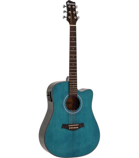 Dreadnought Western-Gitarre Lieferumfang 1 x Instrument, 1 x Innensechskantschlüssel, 1 x Batterie, Batterie: 1 x 9,0 V E-Block 6F22 Zink-Kohle eingebaut, Ausführung: Rechtshänderversion, Hals: MahagoniGriffbrett: Palisander 20 Bünde, Korpus: 4/4 Dreadnought-FormMahagoni lackiert, Mensur: 650 mm, Sattelbreite: 43 mm, Steg: Palisander, Saitenanzahl: 6, Equalizer: 1 x Regler 2-Band, Decke: Fichte massiv, Farbe: Hellblau, hochglänzend, lackiert, Gewicht: 2,20 kg ...