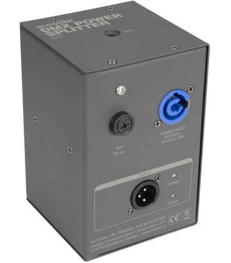2-fach Power- und DMX-Splitter zur Trussmontage Zuverlässiger Power- und DMX-Verteiler, 1 P-Con-Eingang auf 2 Ausgänge, max. 10 A, 1 DMX-Eingang auf 2 Ausgänge, Ein- und Ausgang galvanisch getrennt, Stabiles Metallgehäuse, Jeder DMX-Ausgang mit unabhängigem Treiber und Statusanzeige, Lieferumfang 1 x Gerät, 1 x Netzkabel/Stromkabel, 1 x Bedienungsanleitung, Stromversorgung: 100-240 V AC, 50/60 Hz, Gesamtanschlusswert: 2 W, Ausgangsstrom: Max. 2 x 5 A je Kanal, Stromanschluss: Stromeinspeisung über P-Con (blau), Einbauversion Stromanschlusskabel mit Schutzkontaktstecker, Stromausgang: 2 x P-Con (grau), Einbauversion, DMX-Eingang: 3-pol XLR (M), DMX-Ausgang: 2 x 3-pol XLR (W) galvanisch getrennt mit unabhängigem Treiber und Statusanzeige, Status LED: Power, DMX, Maße: Breite: 9 cmTiefe: 10 cmHöhe: 13,6 cm, Gewicht: 1,00 kg ...