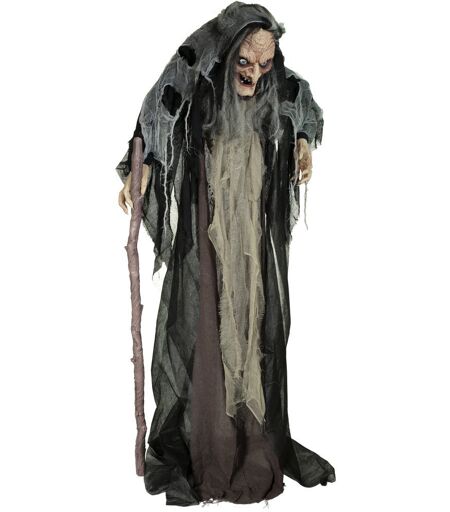 Diese Standfigur von Europalms eignet sich hervorragend für die Dekoration zu Halloween oder Ihrer Mottoparty.So stellt man sich eine Hexe aus dem Märchenbuch vor! Lange spitze Nase, bösartiger Blick und ein teuflisches Grinsen, das den Blick auf einen fast zahnlosen Mund freigibt. Lange grau-schwarze Haare umrahmen ihr von Falten zerfurchtes Gesicht.Über eine motorisierte Mechanik neigt sich ihr Kopf erst nach vorne und dann auf und ab, als würde sie jemand zunicken. Rot blinkende LEDs in den Augen und boshaftes Hexengelächter vervollständigen den Effekt. Die Arme der Figur lassen sich leicht in Form biegen, so dass es ihr nicht schwerfällt, Ihren Gästen eine Hand zum Gruß entgegen zu strecken. In die andere Hand kann der aus 3 Segmenten bestehende Stock geklemmt werden. Die Animation der Figur wird per integriertem Mikrofon oder kabelgebundener, manueller Steuerung aktiviert.Stehende Figur: Hexe mit LED-Augen Akku-/Batteriebetrieb möglich, Augen rot blinkend, Soundeffekt, Kopf mit Bewegungseffekt, Animationsdauer bis zu 10 Sekunden, Einfach aufzubauen, Arme formbar, Lieferumfang 1 x Figur, 3 x Stab, 1 x Ständer, 1 x Bedienungsanleitung, Stromversorgung: 4,5V DC, Schutzart: IP20, Stromanschluss: Batterie/Akku, Batterie: 3 x Mignon (AA) (nicht im Lieferumfang), Effekt: Augen rot blinkend, Soundeffekt, Kopf mit BewegungseffektÜber Akustiksensor oder TasterDauer bis zu 10s, Aufbau: Einfach aufzubauen, Arme formbar, Aufstellung/Befestigung: Ständer, Saison: Halloween, Maße: Höhe: 160 cm, Gewicht: 1,55 kg ...
