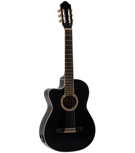 Klassische Gitarre für Linkshänder Lieferumfang 1 x Instrument, 1 x Innensechskantschlüssel, 1 x Batterie, Batterie: 1 x 9,0 V E-Block 6F22 Zink-Kohle eingebaut, Tonabnehmer: 1 x Piezo, Ausführung: Linkshänderversion, Hals: NatoGriffbrett: Walnuss, Korpus: 4/4 Cutaway-FormSapele lackiert, Mensur: 650 mm, Sattelbreite: 50 mm, Steg: Ahorn, Saitenanzahl: 6, Regler: 1 x Lautstärke, 2 x Ton, Binding: Vorderseite und Rückseite weiß, Pinstripe, Decke: Fichte, Farbe: Schwarz, Gewicht: 1,85 kg ...