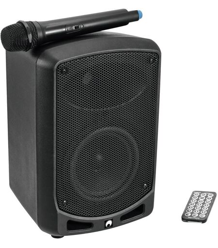 Tragbare 6,5"-PA mit Funkmikrofon, Audioplayer, Bluetooth und 40 W Spitzenleistung Tragbares all-in-one Verstärkersystem mit 40 Watt Leistung, 4-Kanal-Power-Mixer, 2-Wege-Bassreflexsystem, SD-Kartensteckplatz und USB-Anschluss, 1 Mikrofon-Eingang (XLR) mit regelbarem Halleffekt, Integrierter UHF-Funkempfänger mit passendem Handmikrofon, Hocheffizienter und batterieschonender Class-D-Verstärker, Klangregler und Master-Regler, UHF 863 - 865 MHz Anmelde- und gebührenfrei in Europa, Für Anwendungsgebiete wie zum Beispiel: Theater, mobilen Einsatz, Hochzeit/Gala/Events, Produktpräsentationen und Vorträge, Metallgitter in schwarz, Robuster Tragegriff, Integrierte Ladeautomatik, Die Gerätekühlung erfolgt über passive Konvektionskühlung, Akku Akku muss separat bestellt werden, Betriebsdauer bis zu 4h, Kabellos, flexibel und vielseitig einsetzbar, Audioplayer Ansteuerbar über Bluetooth, IR-Fernbedienung, 4 stelliges 7-Segment-LED Display, 2,4 GHz weltweit anmelde- und gebührenfrei, Bluetooth: Reichweite von bis zu 10m, Mikrofon Richtcharakteristik: Niere, Reichweite von bis zu 30m, Fernbedienung Reichweite von bis zu 10m, Lieferumfang 1 x Gerät, 1 x Netzkabel/Stromkabel, 1 x Mikrofon, 1 x Fernbedienung, 1 x Bedienungsanleitung, 1 x Konformitätserklärung, Stromversorgung: 100-240 V AC, 50/60 HzOder12V DC, Gesamtanschlusswert: 60 W, Schutzart: IP20, Schutzklasse: SK I, Ausgangsleistung: 40 W RMS, Stromanschluss: Stromeinspeisung über Kaltgeräte (M) Einbauversion Stromanschlusskabel mit Schutzkontaktstecker (mitgeliefert)Batterie/Akku (nicht im Lieferumfang), Frequenzbereich: 62 - 18000 Hz, Klirrfaktor: , Kühlung: Passive Konvektionskühlung, Frequenzband: UHF 863 - 865 MHz, Trägerfrequenz: 865 MHz, Frequenzstabilität: ± 0,005 %, Frequenzwahl: Festfrequenzen, Gehäusefarbe: Schwarz, Aufnahmesystem: Flansch: Ø 35mm, Schaltung: Class D, Steuerelemente: Echoeffekt-Regler, Audioplayer, Status LED: Power, Peak, ON AIR, Signal, Ladezustandsanzeige, Anschlüsse: Eingang: Mikrofon über 1 x 3-pol XLREingang: Line über 1 x Stereo-CinchAusgang: Line über 1 x 6,3-mm-Klinke (unsym.), Kanäle: Mikrofonkanal: 1 x Mono über XLR, Kanalregelung über DrehreglerEingangskanal: 1 x Stereo über Cinch, Kanalregelung über DrehreglerEingangskanal: 1 x Stereo über Audioplayer, Kanalregelung über DrehreglerEingangskanal: 1 x Mono über Funk, Kanalregelung über DrehreglerMaster-Ausgang: 1 x Mono, Kanalregelung über Drehregler, Klangregelung EQ, Lautsprecher: 1 x 6,5" Tieftöner1 x 1" Hochtöner, Lautsprechertyp: Kompakt-Box, Drahtlos-PA-System, Bauart: Bassreflex, Tragegriff: 1 Stück, Material: ABS Acrylnitril-Butadien-Styrol-Copolymere, Farbe: Schwarz, Maße: Breite: 23,5 cmTiefe: 22 cmHöhe: 35 cm, Gewicht: 4,15 kg, Mikrofon, Stromversorgung: 3V DC, Stromanschluss: Batterie/Akku, Kapseltyp: Dynamisch, Richtcharakteristik: Niere, Batterie: 2 x Mignon (AA) (nicht im Lieferumfang), Reichweite: Bis zu 30m, RF-Ausgangsleistung: 10 mW, Modulation: FM, Schalter: Ein/Aus/Mute-Schalter, Material:... ...