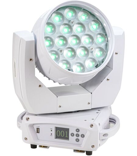Washlight mit 19 starken 15-W-4in1-LEDs, motorischem Zoom und weißem Gehäuse 19 leistungsstarke LEDs 15 W COB (Chip-on-board) 4in1 QCL RGBW (homogene Farbmischung)3 Segmente einzeln ansteuerbar, Positionierung innerhalb 630° PAN, 270° TILT, Auto-Positionskorrektur (Feedback), Exakte Positionierung (16-Bit-Auflösung), Zoom motorisch, Integrierte Showprogramme, Die Gerätekühlung erfolgt über Lüfter temperaturgeregelt im Kopf, Lüfter in der Base, Ansteuerbar über Stand-alone, DMX, Musiksteuerung über Mikrofon, Master/Slave Funktion, QuickDMX über USB (optional), W-DMX by Wireless Solution über USB (optional), CRMX by LumenRadio über USB (optional), Flimmerfrei, Mit einem Abstrahlwinkel von 1° - 40°, Mehrfarbiges LCD Display, Farbmischung stufenlos, Farbwechsel einstellbar, Dimmer elektronisch, Stroboskop-Effekt, Bereits vorprogrammiert bei Light´J, LED PC-Control 512, EASY SHOW 1, Light Captain, Netzeingang und Netzausgang zum einfachen Zusammenschalten von bis zu 8 Geräten, Für Anwendungsgebiete wie zum Beispiel: Clubs/Tanzschulen, Hochzeit/Gala/Events, Bühne, Mobile DJ´s / Alleinunterhalter, Verleiher, Einsatzmöglichkeit: Stehend, fliegend, Lieferumfang 1 x Movinglight, 1 x Bedienungsanleitung, 1 x Netzkabel/Stromkabel, 2 x Omega-Bügel, Stromversorgung: 100-240 V AC, 50/60 Hz, Gesamtanschlusswert: 225 W, Schutzart: IP20, Stromanschluss: Stromeinspeisung über P-Con (blau), Einbauversion Stromanschlusskabel mit Schutzkontaktstecker, Stromausgang: P-Con (grau), Einbauversion, Sicherung: 5 x 20 mm, T 2 A Sicherung auswechselbar, Lampenart: LED-Lampe, LED-Typ: 19 x 15 W COB (Chip-on-board) 4in1 QCL RGBW (homogene Farbmischung), Max. Kippbewegung TILT: 270° exakte Positionierung (16-Bit-Auflösung) Auto-Positionskorrektur (Feedback), Max. Schwenkbewegung PAN: 630° exakte Positionierung (16-Bit-Auflösung) Auto-Positionskorrektur (Feedback), Ausstattung: Zoom motorisch, DMX-Kanäle: 16, 24, DMX-Eingang: 3-pol XLR (M) Einbauversion, DMX-Ausgang: 3-pol XLR (W) Einbauversion, Kühlung: Lüfter temperaturgeregelt im KopfLüfter in der Base, Ansteuerung: Stand-alone, DMX, Musiksteuerung über Mikrofon, Master/Slave Funktion, QuickDMX über USB (optional), W-DMX by Wireless Solution über USB (optional), CRMX by LumenRadio über USB (optional), Vorprogrammiert bei: Light´J, LED PC-Control 512, EASY SHOW 1, Light Captain, Projektion: Flimmerfrei, Abstrahlwinkel: 1° - 40°, Abstrahlwinkel (1/2 Peak): 1 - 25°, Abstrahlwinkel (1/10 Peak): 8 - 40°, Beleuchtungsstärke in Lux (lx): Eng rot (R) 3m: 2779 lx, 6m: 763 lxEng grün (G) 3m: 7893 lx, 6m: 1841 lxEng blau (B) 3m: 1468 lx, 6m: 390 lxEng kaltweiß (CW) 3m: 9558 lx, 6m: 2468 lxEng alle 3m: 19553 lx, 6m: 5001 lxWeit rot (R) 3m: 272 lx, 6m: 73 lxWeit grün (G) 3m: 583 lx, 6m: 160 lxWeit blau (B) 3m: 117 lx, 6m: 34 lxWeit kaltweiß (CW) 3m: 740 lx, 6m: 211 lxWeit alle 3m: 1568 lx, 6m: 439 lx, Gehäusefarbe: Weiß, Displaytyp: Mehrfarbiges LCD Display, Maße: Breite: 30,5 cmTiefe: 20,0 cmHöhe: 40,0 cm, Gewicht: 8,62 kg,... ...