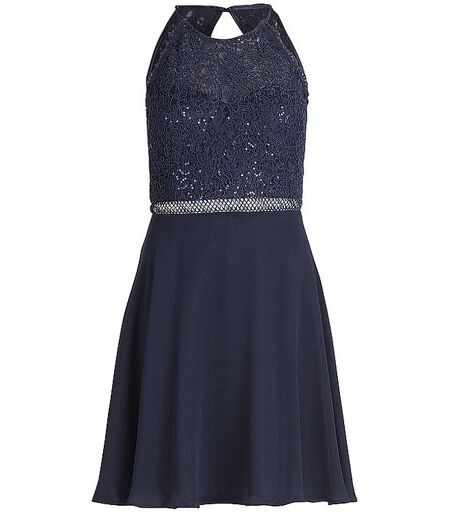 Elegantes Damen Cocktailkleid aus Chiffon mit Spitze Ohne Arm Rundhalsausschnitt Cut Out mit Knopfverschluss auf der Rückseite Schließt mit Reißverschluss auf der Rückseite Taillierte Passform Unifarben Knieumspielend Gesamtlänge: 96 cm Länge ab Taille: 54 cm Farbbezeichnung: Night Sky Material: 100 % Polyester ...