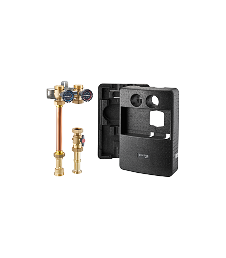 Oventrop Regumat Kessel-Anbindesystem 1355070mit universellermodular aufgebauter Wärmedämmungbestehend aus Absperreinrichtung mit 2 Kugelhähnen und 2 Thermometern (ohne Überströmvorrichtung)WandhalterungFlanschrohrSperrventilDistanzstückPumpenkugelhahn vor der PumpeWärmedämmung ...