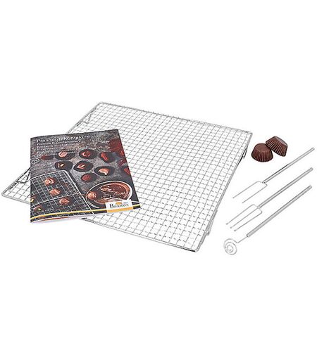 Ein Tag ohne Schokolade ist möglich - aber sinnlos! Mit dem fünfteiligen Pralinen-Set aus der Serie Chocolaterie von RBV Birkmann wird die Herstellung von zarten Pralinen zum Kinderspiel. Denn mit diesem Set erhalten Sie alles, was Sie für perfekte Pralinen benötigen: ein Abtropfgitter (30 x 30 cm), zwei Pralinengabeln, eine Tauchspirale, 50 Pralinen-Papierförmchen und ein Rezeptheft, z. B. für Trüffelpralinen, warten auf Sie. Alle Teile sind aus hochwertigem Edelstahl gefertigt und helfen Ihnen dabei, formschöne Pralinen zu zaubern. Das Set wird in einer hochwertigen Geschenkverpackung geliefert. Und wenn nicht alle Köstlichkeiten sofort vernascht werden, sind die vollmundigen Werke auch eine prima Geschenkidee. Denn selbstgemachte Schokolade und Pralinen in den kreativen Geschmacksrichtungen sind in aller Munde - und das ist wörtlich zu nehmen. Warnhinweis: Vermeiden Sie den Kontakt mit offenen Flammen oder direkter Hitze. Schützen Sie sich und verwenden Sie beim Umgang mit heißen Gegenständen stets Ofenhandschuhe. Verwenden Sie die Backformen ausschließlich für ihren vorgesehenen Zweck. Unsachgemäßer Gebrauch kann die Funktion beeinträchtigen oder das Produkt beschädigen. Backformen sollten von Kindern nur unter Aufsicht eines Erwachsenen verwendet werden, insbesondere, wenn sie scharfe oder bewegliche Teile enthalten. Prüfen Sie die Produkte regelmäßig auf Abnutzungen oder Schäden. Produkte mit sichtbaren Rissen oder Brüchen sollten entsorgt werden, um Verletzungen oder ungewollte Materialrückstände in Lebensmitteln zu vermeiden ...