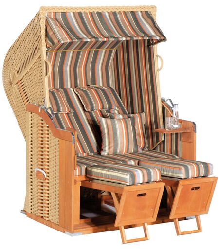 Artikelnummer: 80556 Strandkorb RUSTIKAL 250 PLUS – Komfortabler 2-Sitzer für entspannte Stunden im Freien . Erleben Sie pure Entspannung mit dem SUNNY SMART RUSTIKAL 250 PLUS Strandkorb. Dieser hochwertige Gartenstrandkorb kombiniert klassisches Design mit modernen Materialien und bietet höchsten Komfort für gemütliche Stunden in Ihrem Garten, auf der Terrasse oder dem Balkon. Dank der robusten Bauweise und wetterfesten Materialien ist dieser Strandkorb nicht nur ein optisches Highlight, sondern auch besonders langlebig. Der RUSTIKAL 250 PLUS ist kein Selbstbausatz, sondern ein komplett montiertes Modell, das sofort einsatzbereit ist. Mit seinem stabilen Gestell aus nordischem Fichtenholz und dem hochwertigen 14 mm Kunststoffgeflecht in Breitoptik verbindet dieser Strandkorb Natürlichkeit mit moderner Widerstandsfähigkeit. Die wetterfeste Lasur des Holzes sorgt für eine lange Lebensdauer, während die verzinkten Metallteile zusätzliche Stabilität und Korrosionsschutz bieten. Die großzügigen Maße von ca. 125 x 90 x 160 cm (B x T x H) bieten ausreichend Platz für zwei Personen. Die mehrfach verstellbare Rückenlehne erlaubt es, den Strandkorb je nach Bedarf aufrecht oder in eine gemütliche Liegeposition zu bringen. Die integrierten Fußstützen mit weichen Polstern sorgen für zusätzlichen Komfort, während die weichen Strukturpolyester-Polsterungen für ein angenehmes Sitzgefühl sorgen. Im Lieferumfang enthalten sind zwei Nackenkissen, zwei Kuschelkissen und zwei geteilte Fußkissen, die den Sitzkomfort weiter erhöhen. Dank der hochwertigen, pflegeleichten Bezüge bleibt der Strandkorb lange schön und strapazierfähig. Die Polster sind mit Möbelschaumstoff gefüllt und bieten angenehme Unterstützung für Rücken, Sitzfläche und Beine. Zusätzlichen Komfort bieten die praktischen Seitentische, auf denen Sie Getränke, Snacks oder ein Buch abstellen können. Die stabilen Tragegriffe ermöglichen ein einfaches Versetzen des Strandkorbs innerhalb Ihres Außenbereichs. Dank der wetterbeständigen Materialien ist dieser Strandkorb bestens für den ganzjährigen Einsatz im Freien geeignet. Das widerstandsfähige Kunststoffgeflecht trotzt Sonne, Regen und Wind, während die verzinkten Metallteile zuverlässig gegen Rost geschützt sind. Damit ist der RUSTIKAL 250 PLUS die ideale Wahl für alle, die auf langlebige Qualität und hohen Sitzkomfort setzen. Hochwertiger 2-Sitzer Strandkorb mit bequemer Polsterung. Die montierte Anlieferung ermöglicht eine sofortige Nutzung ohne aufwendige Montage. Die mehrfach verstellbare Rückenlehne sorgt für maximalen Komfort, während die Fußstützen mit gepolsterten Kissen das Entspannen noch angenehmer machen. Das robuste Kunststoffgeflecht und der stabile Holzrahmen garantieren Langlebigkeit. Die Strukturpolyester-Polsterung bietet hohen Sitzkomfort und die praktischen Seitentische machen den Aufenthalt noch angenehmer. Dank wetterbeständiger Materialien ist der Strandkorb für den ganzjährigen Einsatz im Freien ideal. Gönnen Sie sich mit dem SUNNY... ...