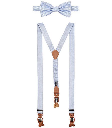 Hosenträger und Fliege im Set Serie: Prince Bowtie Elastisches Material - längenverstellbar Details in Lederoptik Inkl 6 Knopf-Clips Farbbezeichnung: Hellblau Perfekt für festliche Anlässe ...