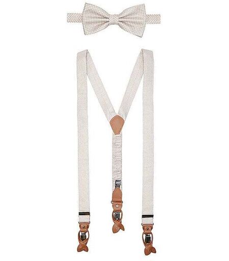Hosenträger und Fliege im Set Serie: Prince Bowtie Elastisches Material - längenverstellbar Details in Lederoptik Inkl 6 Knopf-Clips Farbbezeichnung: Beige Perfekt für festliche Anlässe ...