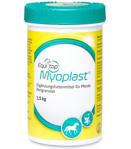 Anwendungsgebiet von Equitop Myoplast GranulatEquitop Myoplast Granulat ist ein Ergänzungsfuttermittel für Pferde - das optimale Ergänzungsfuttermittel für natürlichen Muskelaufbau. Das optimale Ergänzungsfuttermittel für natürlichen Muskelaufbau Auf die Leistungsbereitschaft eines jeden Pferdes nehmen viele verschiedene Faktoren Einfluss. Und auch wenn der Mensch auf ein ganz entscheidendes Detail, die angeborene Veranlagung, keinen Einfluss hat, so gibt es doch viele Faktoren, auf die man positiv einwirken kann. Zum Beispiel auf Haltung, Ausbildung, Equipment und Fütterung. Besonders der optimalen Fütterung kommt eine große Bedeutung zu. Neben dem fachgerechten Training bestimmt die Fütterung über die Entwicklung des Muskelaufbaus eines Pferdes. Die Muskulatur eines jeden Turnier- und Freizeitpferdes erfüllt wichtige Funktionen: Sie gibt dem Körper seine Form und ist das aktive Organ aller Bewegungen. Insbesondere die Muskeln an Hals, Rücken, Kruppe und Hinterhand spielen eine wichtige Rolle bei der Entfaltung der vollen Leistungsfähigkeit. Equitop Myoplast® ist ein hochwertiges Ergänzungsfuttermittel, das Ihr Pferd aktiv und auf natürlichem Weg beim Aufbau seiner Muskulatur und deren Funktionen unterstützt. Dafür sorgen 18 Aminosäuren. Langjährige Erfahrungen und Studien haben gezeigt, dass bereits nach zwei bis vier Wochen eine Verbesserung von Rittigkeit, Leistungsbereitschaft, Kondition, Bemuskelung und Gesamtkonstitution festgestellt werden kann. Das Produkt: Ein hochwertiges Ergänzungsfuttermittel aus natürlichem Rohstoff von Süßwasser-Mikroalgen und hohem Gehalt an leicht verfügbarem, hochwertigem Protein. Equitop Myoplast® enthält ein komplettes Profil aus 18 auf die Muskulatur abgestimmten Aminosäuren, inkl. aller 10 für das Pferd essentiellen Aminosäuren. Starke Vorteile: ...
