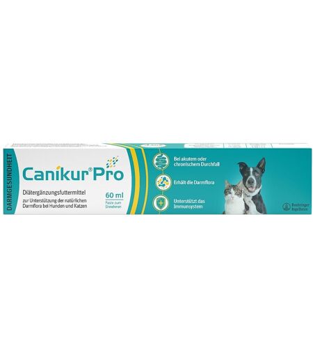 Anwendungsgebiet von Canikur Pro Paste Hund & Katze zur Unterstützung der DarmfloraCanikur Pro Paste Hund & Katze zur Unterstützung der Darmflora ist ein Diät-Ergänzungsfuttermittel für Hunde und Katzen zur Stabilisierung der physiologischen Verdauung. Als praktische Pasteleicht zu fütternschmeckt Hunden und Katzen gutpasst in jede Reiseapotheke 3-fach-kombiniertProbiotikum (E. faecium): dient dem Schutz der Darmwand und Stärkung des ImmunsystemsPräbiotikum (Bio-Mos®-C): fördert das Wachstum und die Aktivität bestimmter, für die Darmflora günstiger BakterienartenAdsorbens (Bentonit): bindet durch seine Oberflächenstruktur Giftstoffe und Viren/Bakterien, die sich negativ auf die Darmflora auswirken können Canikur®Pro – zur Unterstützung der natürlichen Darmflora – Diät-Ergänzungsfuttermittel für Hunde und KatzenCanikur®Pro ist ein pro- und präbiotisches Diät-Ergänzungsfuttermittel für Hunde und Katzen zur Regulation der physiologischen Verdauung. Es kann begleitend während und nach einer Durchfall-Therapie zur Unterstützung der Darmflora gegeben werden.Durchfall gehört leider zu den häufigsten Gründen, aus denen wir mit unseren Haustieren tierärztliche Hilfe suchen. Hat unser Hund oder unsere Katze Durchfall, wird gleichzeitig auch die Darmflora angegriffen. Umgekehrt führt eine veränderte Darmflora oftmals zu Durchfall. Ein Ungleichgewicht der Darmflora kann durch die Gabe eines Synbiotikums wieder ausbalanciert werden. Die häufigsten Fragen und Antworten rund um Canikur®ProWarum hat mein Hund/meine Katze Durchfall?Durchfall ist ein Symptom, für das es viele Ursachen gibt. Allen gemein ist, dass sie zu vermehrtem Wasserverlust über den Kot führen. Die Ursachen können harmlos, aber auch schwerwiegend sein.Bei Durchfall sollten Sie Ihr Tier immer aufmerksam beobachten und gegebenenfalls diätetisch unterstützen und ggf. den Tierarzt kontaktieren. Canikur®Pro bietet sich als natürliches DiätErgänz ...