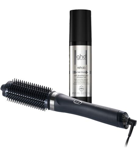 ghd duet blowdry™ Hair Dryer Brush schwarz + ghd rehab fine hair thickener 95 ml als Set. ghd duet blowdryTM ist die 2-in-1 Hair Dryer Brush von ghd, die das Haar gleichzeitig trocknet und diesem mehr Form gibt. Diese Heißluftbürste ist der schnellste Weg, um einen professionellen Blow Dry Look zu Hause zu kreieren – für geschmeidiges und voluminöses Föhn-Styling, das 24 Stunden hält. Die revolutionäre Heat-Air Xchange TechnologieTM kombiniert einen kontrollierten Luftstrom mit einer beheizten Platte und sanft gleitenden, beheizten Borsten. Zwei Wärmesensoren überwachen die Temperatur 400 Mal pro Sekunde, sodass die optimale Stylingtemperatur für nasses Haar von 120 °C auf der Platte und maximal 150 °C Luftstromtemperatur konstant gehalten wird. Die elliptische Form des Bürstenkopfs ermöglicht präzises Styling direkt vom Haaransatz an. Entwickelt für alle Haartypen. Wet to Blow Dried mit einem Tool Heat-Air Xchange TechnologieTM Beheizte elliptisch geformte Platte Sanft gleitende Borsten Gesprächsfreundlicher Geräuschpegel Weniger Energieverbrauch Automatischer Schlafmodus nach 30 Min ohne Verwendung 2,7 m langes Kabel 2 Jahre Herstellergarantie ghd rehab fine hair thickener ist ein Leave-in Spray, das feinem und dünnem Haar sofort mehr Fülle verleiht. Die fortschrittliche Formel verdickt jede einzelne Strähne spürbar3 – für sichtbar volleres Haar und strahlenden Glanz. Die durch Hitze aktivierte, schwerelose Formel verleiht feinem Haar augenblicklich mehr Fülle und Stärke3 – für natürliches Volumen. Erziele transformative Ergebnisse bei feinem oder dünnem Haar und erlebe spürbar dickeres4 Haar mit gesundem Glanz. Für ein rundum gepflegtes, gesundes Haargefühl.5 Anwendung - Schritt 1: Auf das nasse Haar auftragen: Da die Schuppenschicht im nassen Zustand um bis zu 50 % geöffnet ist, kann das Produkt tief in das Haar eindringen und seine Wirkung optimal entfalten,statt lediglich die Oberfläche zu umhüllen. Schritt 2: Aktiviere das Produkt durch Hitze: Trockne und Style Dein Haar mit ghd Tools, damit sich die wichtigsten Inhaltsstoffe verflüssigen, tief in die Haarstruktur eindringen und sich gleichmäßig in jeder Strähne verteilen können – für versiegelte Pflege und langanhaltende Wirkung. Die 2-in-1 Hair Dryer Brush verwandelt Dein Haar direkt von nass zu einem Blow Dry Look und aktiviert die Formel von ghd rehab mit Wärme. 1 Verbrauchertest, Sep'23. 78 % von 100 Frauen stimmten zu, dass sich das Haar mit ghd DHR rehab stärker anfühlt und 84 % stimmten zu, dass das Haar weicher wird, im Vergleich zu vor der Anwendung von rehab und Hitzestyling.2 Verbrauchertest, Sep'23. 81 % von 114 Befragten stimmen zu, dass sich das Haar mit ghd DHN rehab gesünder anfühlt als vor dem Hitzestyling und der Anwendung von rehab.3 im Vergleich zu natürlich getrocknetem feinen Haar.4 Verbrauchertest, Sep'23. 77 % von 97 Frauen stimmten zu, dass ghd rehab sofort für ein verdricktes Haargefühl sorgt und 80 % stimmten zu, dass sich das Haar sofort voller anfühlt, im... ...