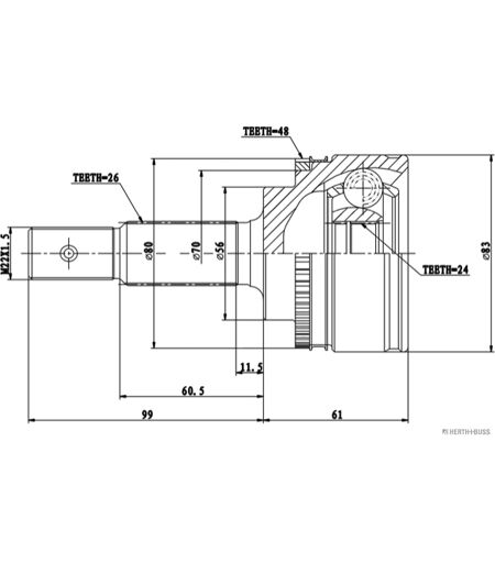 HERTH+BUSS JAKOPARTS Gelenksatz, Antriebswelle mechanisch bearbeitet: mit Einstich im Innenteil (mitte) Flansch-Ø: 56 mm Innenverzahnung Radseite: 24 ABS-Ring-Ø: 80 mm Außenverzahnung Radseite: 26 Zähnezahl ABS-Ring: 48 , u.a. für Toyota Avensis (T22), 1974 cm³, 90 PS (66 kW), 9/1997 bis 2/2003, KBA-Nr: 5013393Toyota Avensis (T22), 1995 cm³, 110 PS (81 kW), 10/1999 bis 2/2003, KBA-Nr: 5013409Toyota Avensis (T22), 1995 cm³, 110 PS (81 kW), 10/1999 bis 2/2003, KBA-Nr: 5013408Toyota Avensis (T22), 1995 cm³, 110 PS (81 kW), 10/1999 bis 2/2003, KBA-Nr: 5013410Toyota Avensis (T22), 1998 cm³, 150 PS (110 kW), 10/2000 bis 2/2003, KBA-Nr: 5013435Toyota Avensis (T22), 1998 cm³, 150 PS (110 kW), 10/2000 bis 2/2003, KBA-Nr: 5013434Toyota Avensis (T22), 1995 cm³, 115 PS (85 kW), 9/2002 bis 2/2003Toyota Avensis (T22), 1995 cm³, 116 PS (85 kW), 9/2002 bis 2/2003 , OE-Nummer:JPN:10P2051-JPNJAPANPARTS:GI-227SHAFTEC:TO125ALFARCOM:240323TrakMotive:40-0426FEBEST:0111-CDT220RHCOMLINE:ECV201SHAFTEC:TO125ARSPIDAN:21297KAVO PARTS:CV-9019DYNAMATRIX:DCV859024NTY:NPW-TY-023NTY:NPW-TY-024ASVA:TYIL-ASV50MAGNETI MARELLI:302015100284VEMA:18927SKF:VKJA 3955BLUE PRINT:ADT38975PEMEBLA:JAPGI-227ATI:48491SNRA:TO2347SNRA:TO2346RCA FRANCE:T903ANMASTER-SPORT GERMANY:303445-SET-MSASHUKI by Palidium:0846-7212NIPPARTS:J2822124ASHIKA:62-02-227JAPKO:62227TRISCAN:8540 13136QUINTON HAZELL:QVJ1178AUTEX:820141DENCKERMANN:C120109MAXGEAR:49-0377FEBEST:0112-CDT220LHSHAFTEC:TO125ARNMEYLE:30-14 498 0027ADRIAUTO:GLCV0022MAGNETI MARELLI:600000061190DEPA:3484850EAI:T98738A1DEPA:3484800FEBEST:0111-CDT220LHKAMOKA:6063LYNXauto:CO-7504ABGA:CV9124AMDR:MCV8227GSP:859024LPR:KTY736SHAFTEC:TO155LSTELLOX:150 1671-SXAUTOTEAM:G400426LÖBRO:303445STC:T439356OPTIMAL:CW1718NK:514521SHAFTEC:TO155RMAPCO:16219Multiparts:12-090251PASCAL:G12083PCRUVILLE:76945SCEVAM:OL6847OPTIMAL:CW-2609NTY:NPZ-TY-084OPEN PARTS:CVJ5544.10BGA:DS9145LAURW:2102121CAR:GTY7380KDA SILVA:J3642FAG:771 0536 30MDR:GSP-859024ASVA:TY-56A48CEVAM:6847GMB:GJ06010AZEKKERT:GS-3796FEBEST:0111-CDT220LH99HART:454 114JAPANPARTS:GI227JMDrive+:DP2110.10.1481SERA:TO346SERA:TO347ASHUKI by Palidium:TO-115IPASCAL:G82010PCBUGIAD:51536CAUTEX:758569ATI:48481DEPA:3484950Metalcaucho:39356ATI:48480RCA FRANCE:TO87AEAI:T98739A1SHAFTEC:TO125ALNFEBEST:0112-CDT220RH ...